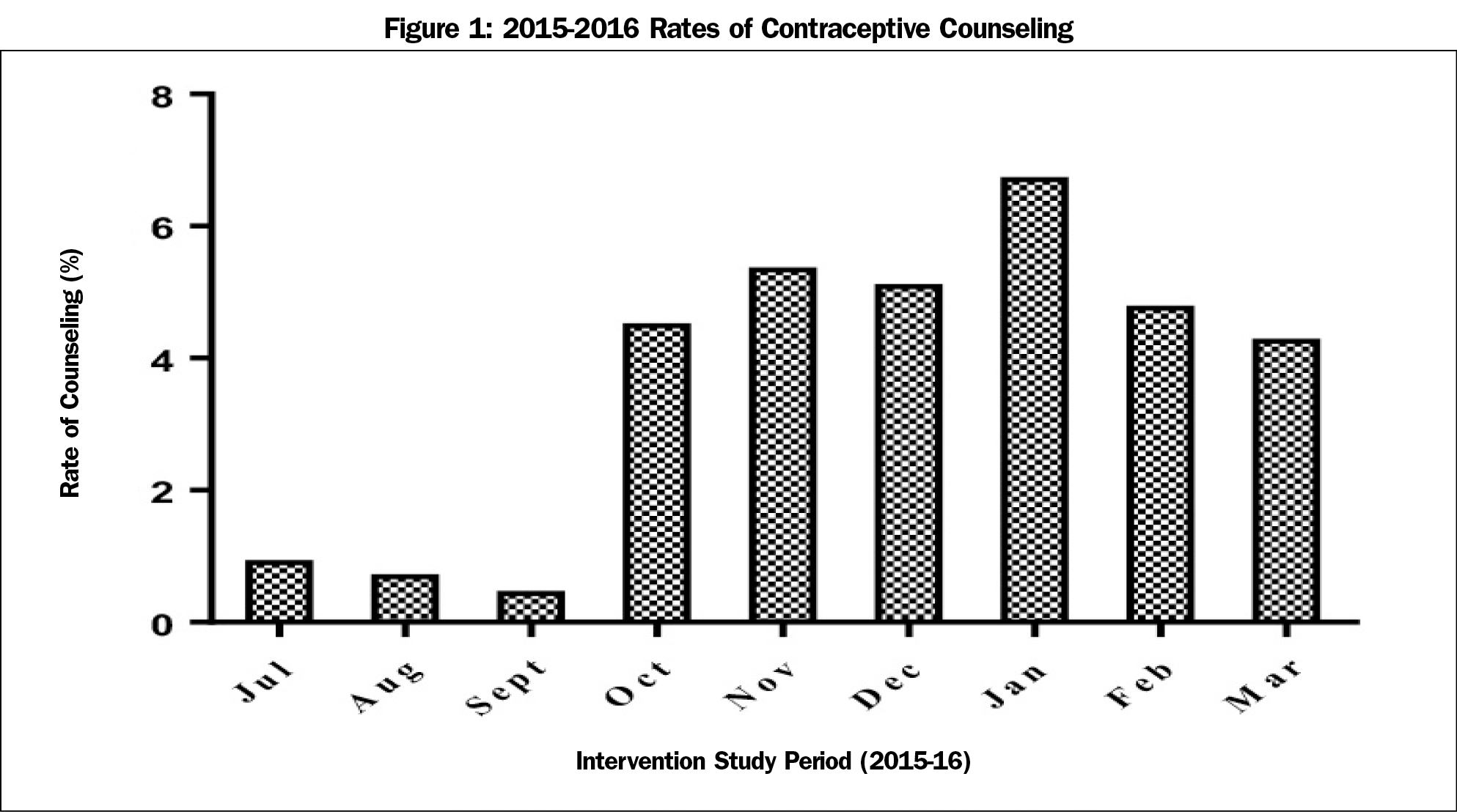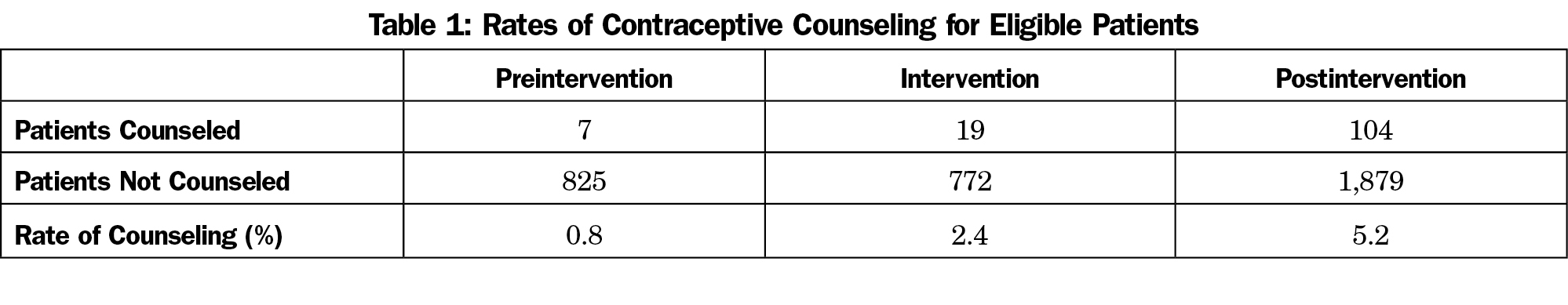 Results: A total of 3,606 patient encounters were included for analysis. Rates of contraceptive counseling in the preintervention period (n=832) and postintervention period (n=1,983) increased significantly (0.8% vs 5.2%, P<0.001). In addition, rates of counseling increased from the intervention phase (n=791) to the postintervention period (2.4% vs 5.2%, P<0.001).