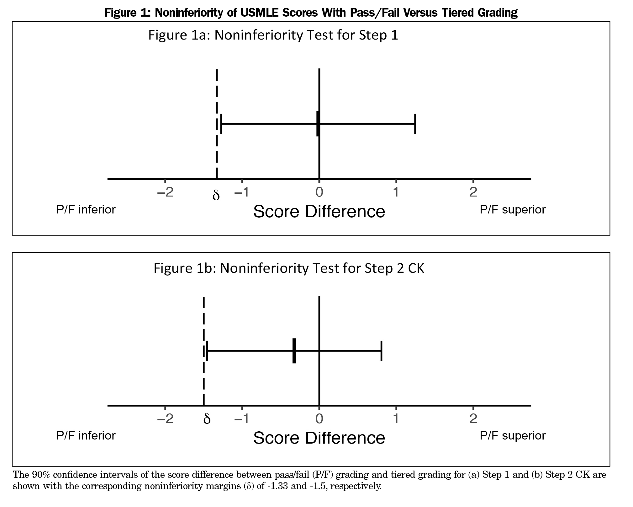 Results: Fifty-six (58.3%) of 96 schools use pass/fail preclinical grading. After adjusting for MCAT, pass/fail grading was not associated with significant differences in average Step 1 (P=0.98) or Step 2 CK (P=0.63). The 90% confidence interval of the effect of pass/fail grading on Step 1 (-1.27, 1.24) did not cross the noninferiority margin of -1.33 (P=0.043). The 90% confidence interval for Step 2 CK (-1.46, 0.81) also did not cross the noninferiority margin of -1.5 (P=0.044).