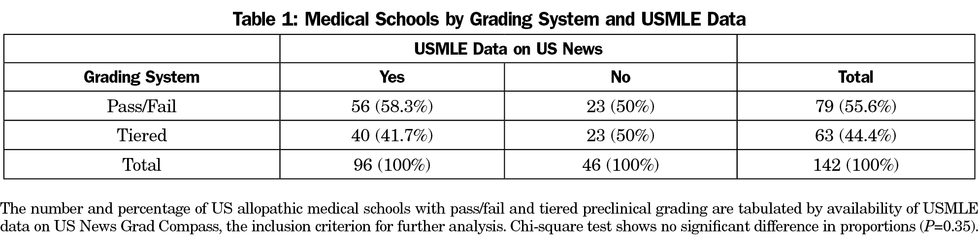 Pass/fail grading in the preclinical years of medical school is associated with improved student well-being.1-3 Students at schools with pass/fail grading have lower levels of stress, emotional exhaustion, and depersonalization, and are less likely to have burnout than those at schools with a grading system with three or more tiers (eg, Honors/Pass/Fail, A/B/C/F).2 Previous studies do not demonstrate significant differences in United States Medical Licensing Examination (USMLE) Step 1 and Step 2 scores after changing from tiered grading to pass/fail grading.1,3,4 However, the studies were conducted at highly selective institutions, so the results may not be generalizable to all medical schools. Average USMLE scores also increased overall during the study periods, potentially masking the effect of pass/fail grading. Although pass/fail preclinical grading has gained popularity in recent years, many schools still use tiered grading despite the benefits of pass/fail grading on student well-being.5 This may be due to concerns about negatively impacting students’ academic achievement and competitiveness for residency. To provide more generalizable and time-controlled evidence toward answering this question, we conducted a cross-sectional study of preclinical grading systems and average USMLE scores across 96 US allopathic medical schools.