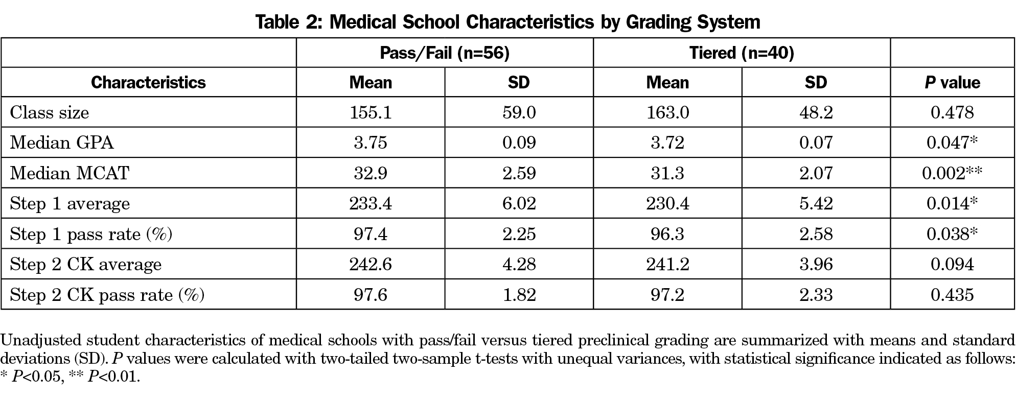 Methods: Preclinical grading systems were identified with the 2017 Association of American Medical Colleges Medical School Admissions Requirements. Median undergraduate grade point average (GPA) and Medical College Admission Test (MCAT) scores and average Step 1 and Step 2 clinical knowledge (CK) scores were available for 96 of 142 US medical schools on US News Grad Compass. Multiple linear regression was used to adjust for entering student characteristics, and one-tailed Student’s t tests were used to test for noninferiority. Noninferiority margins were calculated using standard errors from the USMLE Score Interpretation Guidelines and average class size.