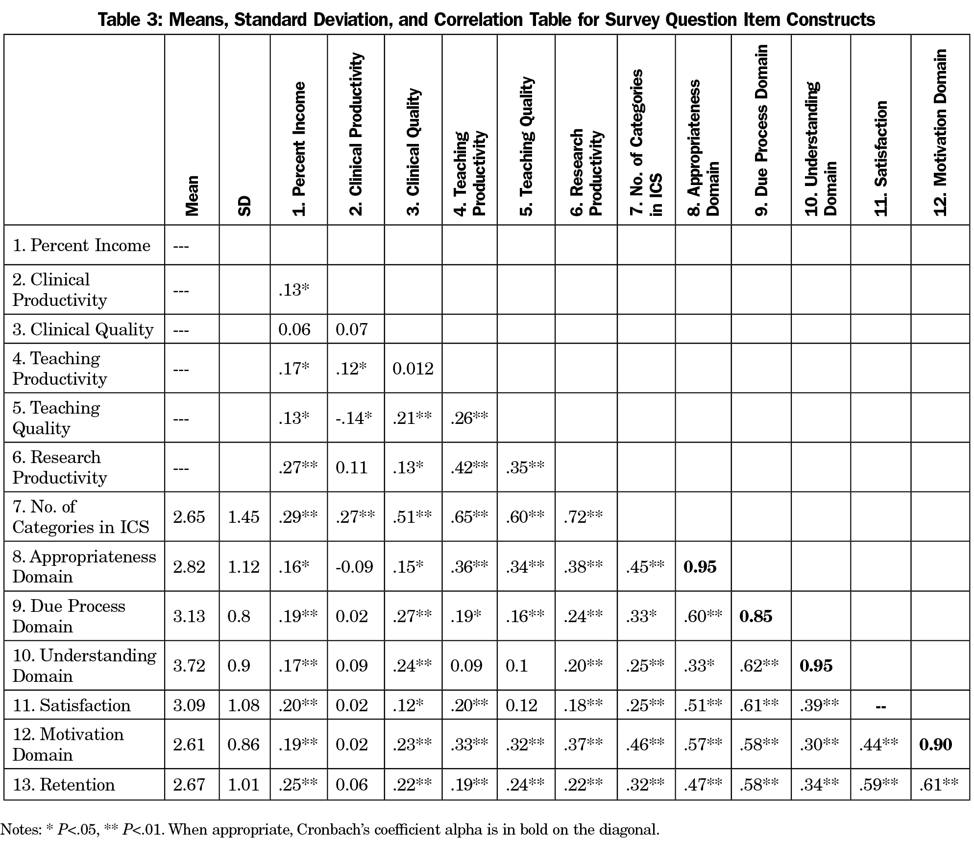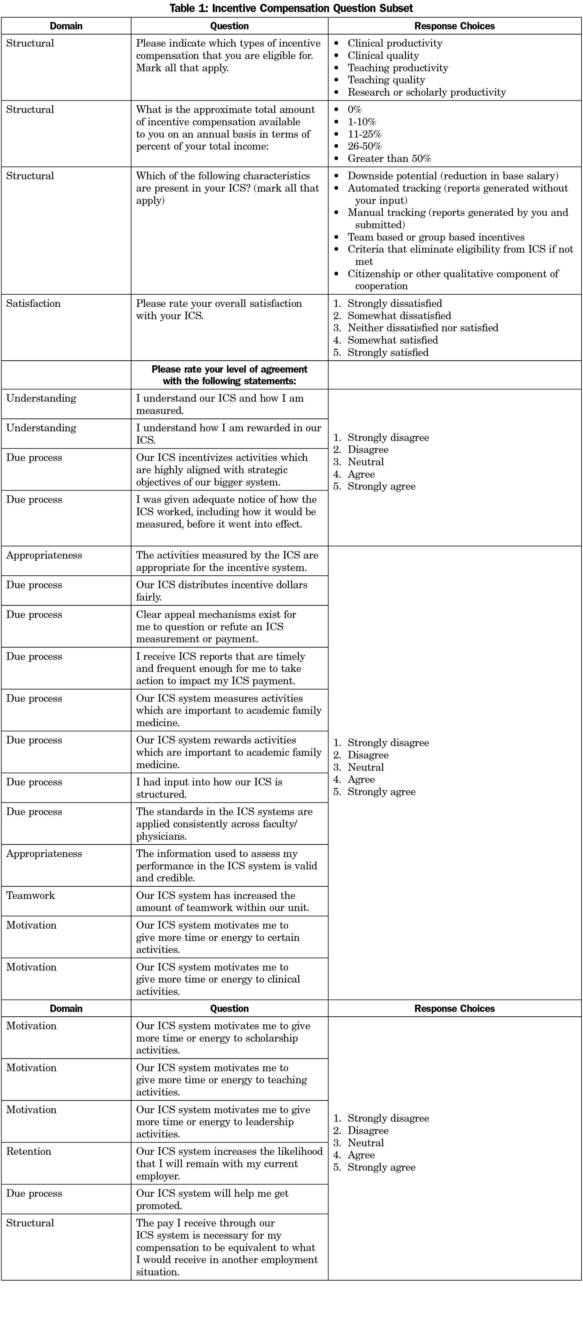 To better understand variability in satisfaction, motivation, and retention, we first examined various structural domain aspects of the ICSs, and then examined faculty perceptions of the implementation as predictors of the outcomes of interest. In particular, we asked faculty whether the behaviors being targeted by the ICS were appropriate (two items: perceptions of appropriateness and perceptions of validity and credibility), whether they understood the ICS (two items: understanding how their ICS measures them and rewards them), and whether they thought the system was implemented with due process (10 items: adequate notice, fair distribution, clear appeal mechanisms, timely and frequent reporting, meaningful input into design, applied consistently, aligned with strategic objectives, information used is credible and valid).