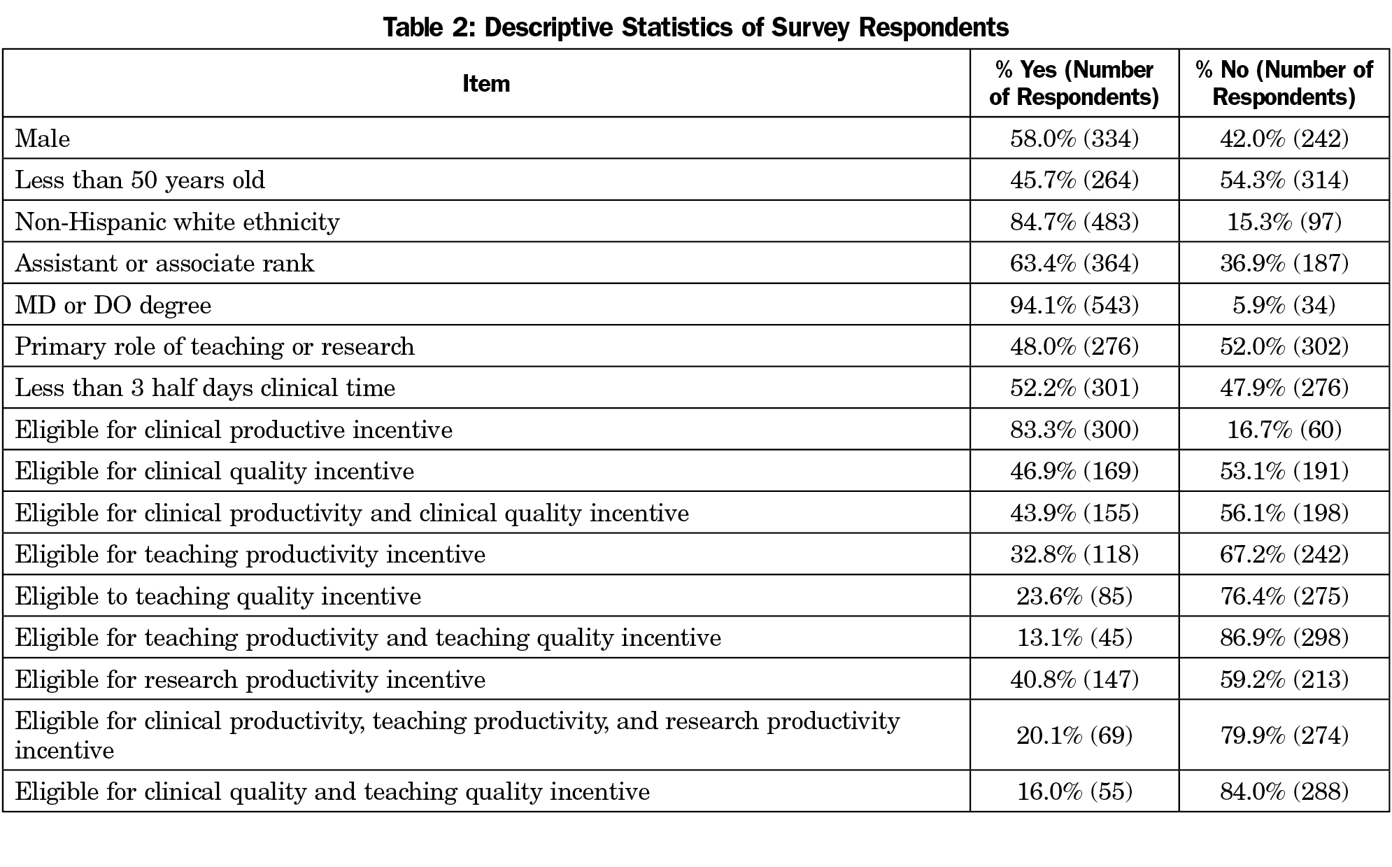 The all-member CERA survey was completed by 581 individuals out of 1,099 potential respondents for a response rate of 52.9%. The incentive compensation system set of questions was completed by 511 individuals for a response rate of 46.5%. The majority of respondents were non-Hispanic white physicians of assistant or associate professor rank (Table 2). Almost three-fourths (70%, 360/511) of academic faculty reported that they were eligible for some type of incentive compensation. Of those reporting that they were eligible for an incentive, 68% reported that 1% to 10% of their total income could come from incentives, 26% reported 11% to 25%, and the final 6% indicated the percentage was greater than 25%.
