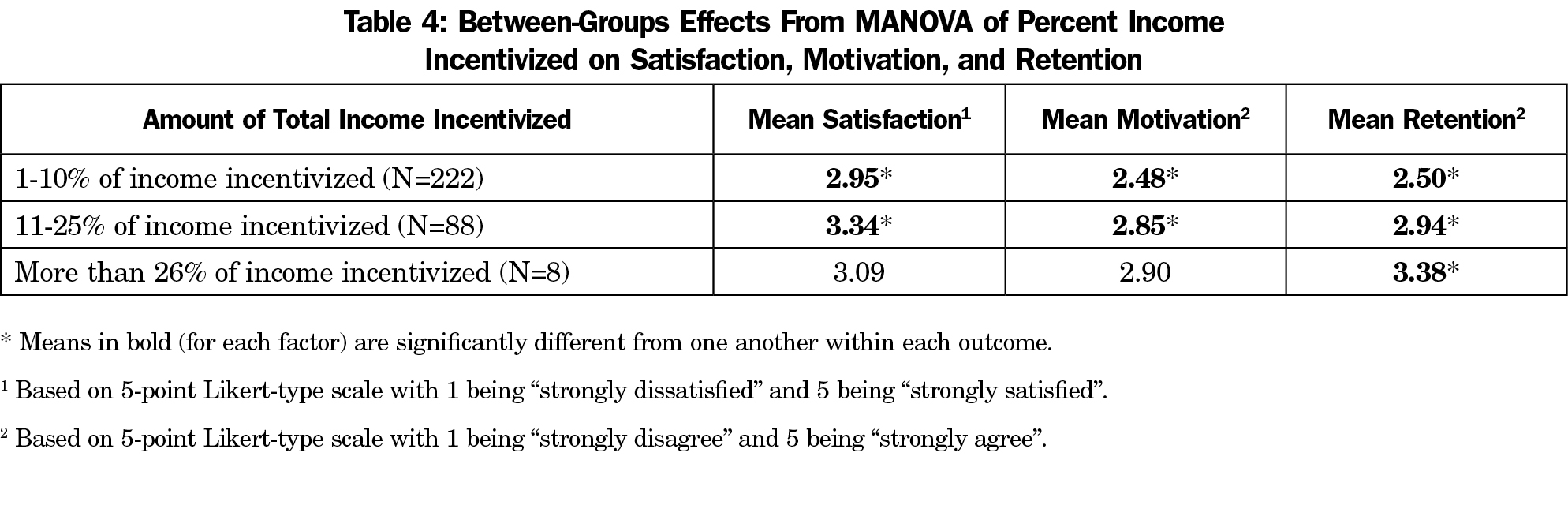 We examined the relationships between percentage of income total that can be incentivized and the outcomes of interest and found positive relationships with satisfaction, motivation, and retention (r’s=.20, .19, .25. P<.01, respectively, see Table 3). However, total income available as incentive explained less than 10% of the variance in faculty satisfaction, motivation, and retention. We then conducted a MANOVA examining the effect of the three income percent levels on these same variables. There was a statistically significant difference on satisfaction, motivation, and retention based on level of total income incentivized, F=3.42 (6,508), P<.01; Wilks lambda=.92. The means indicating the between-groups effects are reported in Table 4. There were significant differences between all three groups on retention, and there was a significant difference between the first and second groups on satisfaction and motivation. It appears that when the incentive was relatively small in comparison to one’s total income, the effect on motivation, satisfaction, and retention was small.
