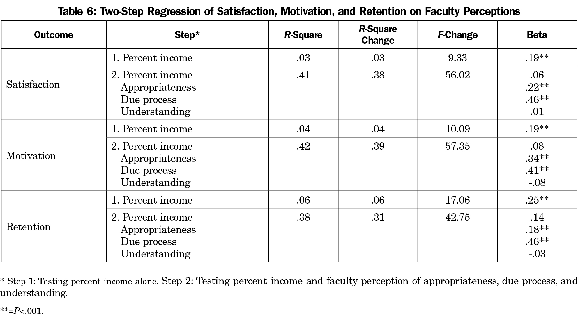Faculty perceptions of appropriateness, understanding of their ICS, and due process were all significantly related to the outcomes of interest (see Table 3). We conducted a series of regression analyses looking at the relative weight of each of these predictors on the outcomes. Given that the percentage of total income significantly predicted each of the outcomes, this was included in the first step of the regression. As reported in Table 6, in each case, perceptions of appropriateness and due process were significant predictors of satisfaction, motivation, and retention, above and beyond the differences accounted for by percent of incentive. Understanding of the system was not a significant predictor when entered with the first two predictors. In each analysis, appropriateness and due process accounted for significant amounts of variance in satisfaction (R2 Δ=.38, P<.001), motivation (R2 Δ=.39, P<.001), and retention (R2 Δ=.31, P<.001), once we accounted for the variance explained by percent of incentive. This suggests that no matter how much of one’s total income the incentive system may include, employees who perceive that the behaviors measured are valid and believe that the system was instituted with due process report greater satisfaction, motivation, and retention.
