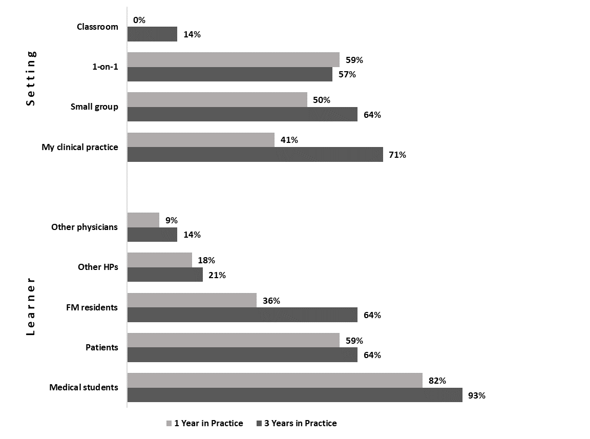 Of those who responded to the surveys, 71% and 74% reported being involved in teaching at 1 and 3 years in practice, respectively. Of those who reported teaching, 50% and 36% were doing locums at 1 and 3 years in practice. At 1 year, physicians reported teaching medical students (82%) and/or patients (59%), and teaching one on one (59%) and/or in small groups (50%). At 3 years, physicians reported teaching medical students (93%), residents (64%), and/or patients (64%), and teaching in their clinics (71%), delivering small group teaching (64%), and/or teaching one on one (57%; Figure 1).
