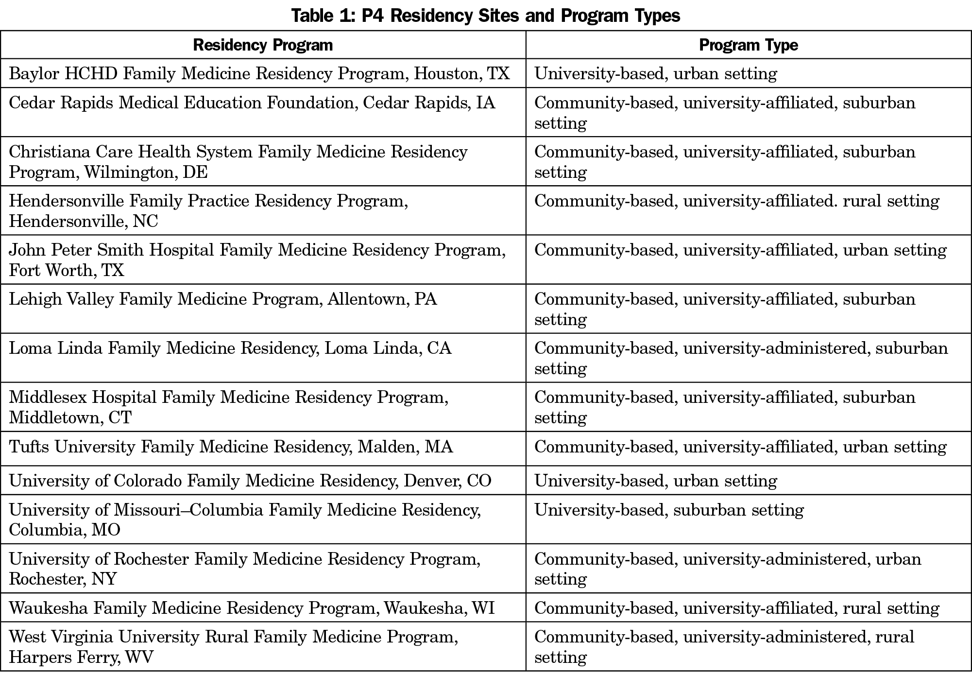 The 14 P4 programs (Table 1) were selected from 84 initial applications submitted in response to a call for proposals provided to all family medicine residencies followed by a blinded peer-review process for 44 full applications that were invited by the internal review committee. Selection criteria included the novelty of proposed innovations, ability to transform training and practices in alignment with the PCMH features, evaluation capacity, and sustainability and financial viability of proposed innovations. The programs chosen were diverse in size, location, setting (urban and rural), and affiliation (community-based and university-based). The P4 programs formed a comparative case study of experiments involving innovations in residency education that aligned with the PCMH and that included changes in the length, structure, content, and location of training and expanded measurements of competency.