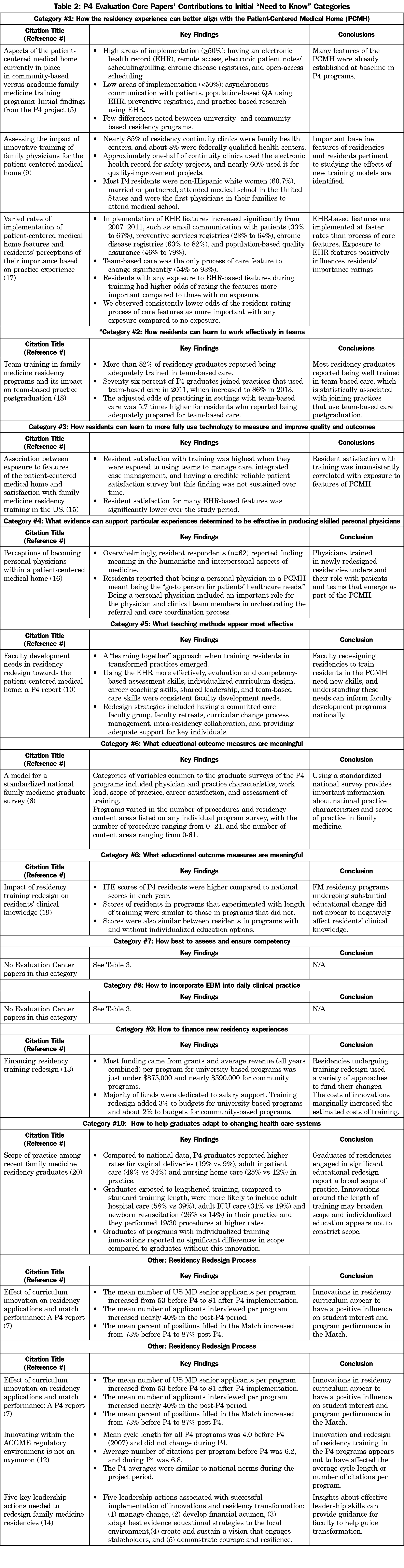 Methods: We conducted both a critical review of P4 published Evaluation Center and site-specific papers and a qualitative narrative analysis of process reports compiled throughout the project. We mapped key findings from P4 to results obtained from a survey of program directors on their top 10 “need to know” areas in family medicine education.