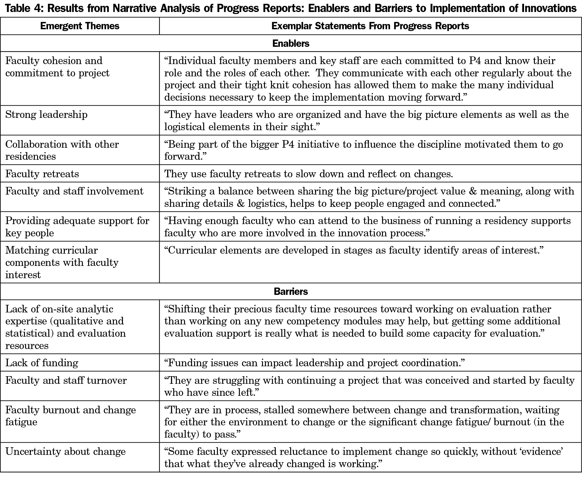 P4 definitely helped create a cadre of faculty who catalyzed change to improve training for our future primary care workforce. We identified enablers and barriers to implementation of innovations in our qualitative analysis of progress reports, which are included in Table 4. Our assessment of faculty development needs toward implementing the PCMH indicated that early in P4, faculty needed skills in using and teaching how to use EHR features, change management, curriculum design, evaluation, individualized learning plans, career coaching, competency-based assessment, and leadership.10 As the project progressed, a “learning together” approach with residents in transformed practices emerged. Given the pace of change and the evolving nature of the PCMH, faculty partnering with residents to gain new skills was warranted. Additionally, leadership actions important for improving the clinical learning environment while simultaneously transforming resident education included: (1) managing change, (2) developing financial acumen, (3) adapting best evidence educational strategies to the local environment, (4) creating and sustaining a vision that engages stakeholders, and (5) demonstrating courage and resilience.14