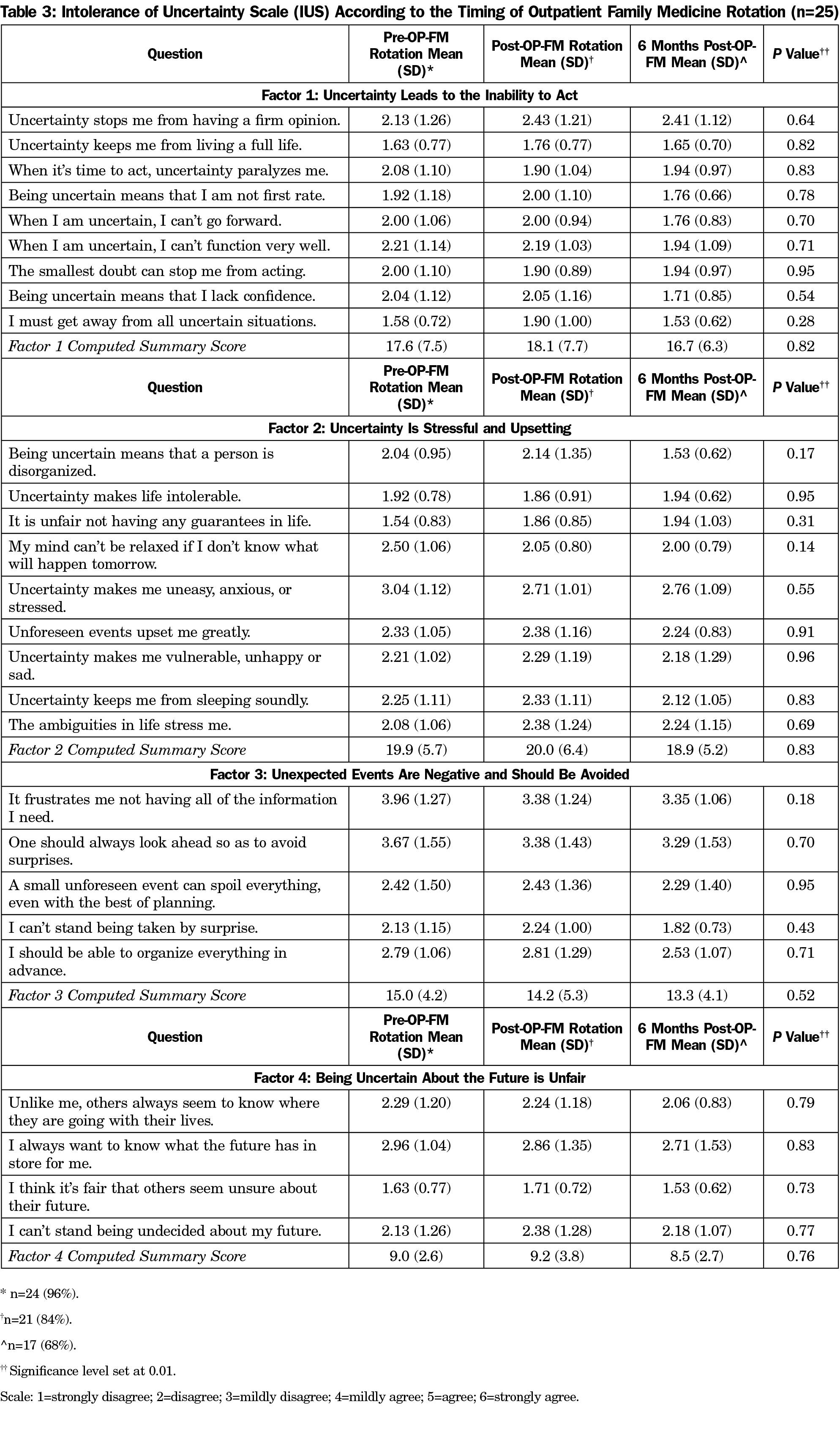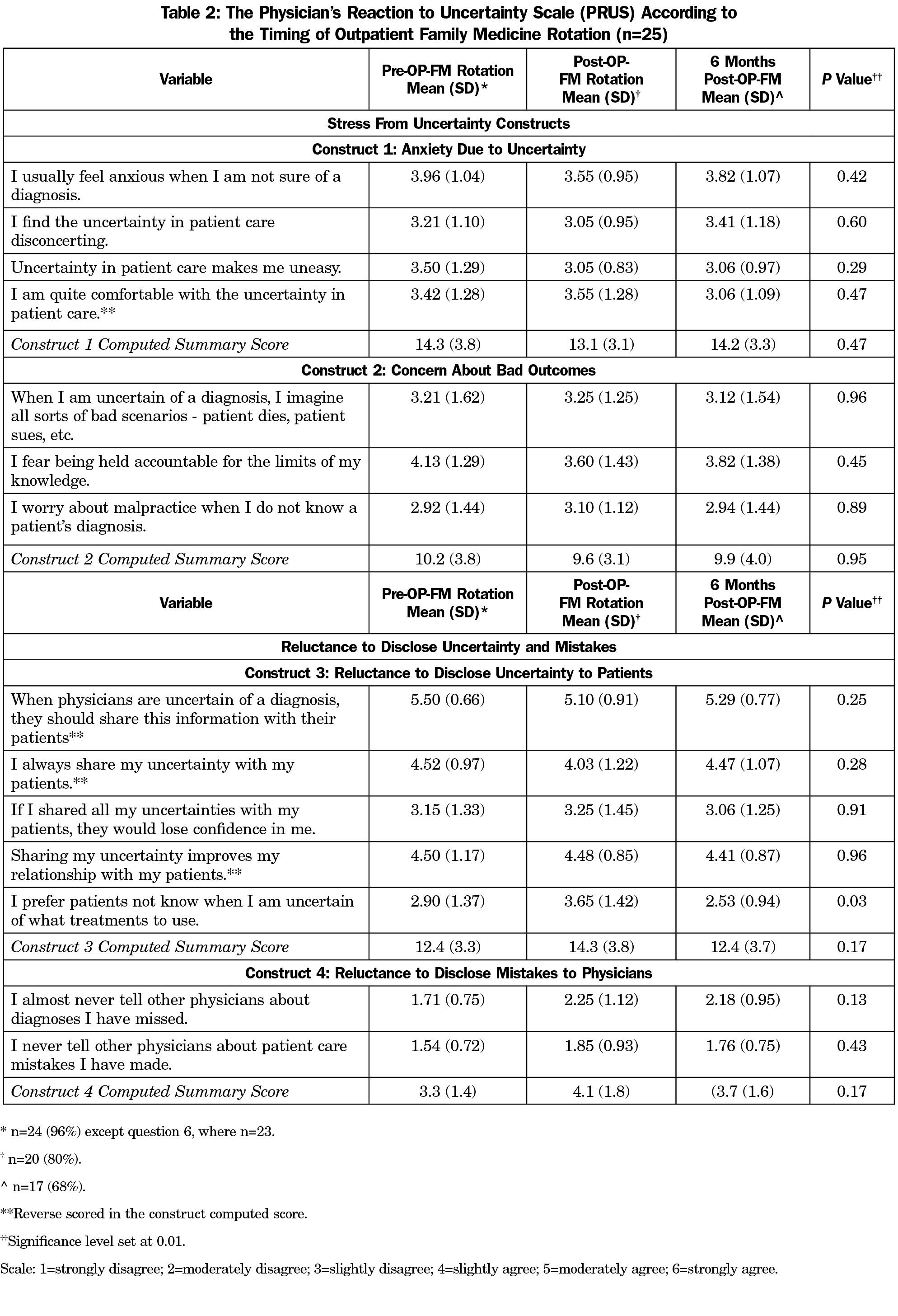 Response rates were 96% (24/25) prior to OPFM-T, 80% immediately following (20/25), and 68% (17/25) at 6 months post-OPFM-T. Participant age averaged 32.6 years (range: 25-48). Participants were predominantly male (52%) and Caucasian (72%; Table 1). One variable on the PRUS survey was borderline statistically different across the assessments related to OPFM-T rotations (Table 2): “I prefer patients not know when I am uncertain of what treatments to use” (2.9 prior to OPFM-T, 3.65 immediately post and 2.53 six-months post; P=.03). However, the computed construct score was not statistically different across the assessment periods. Individual variable and construct scores for the IUS survey (Table 3) showed no statistically significant changes pre- and postrotation.