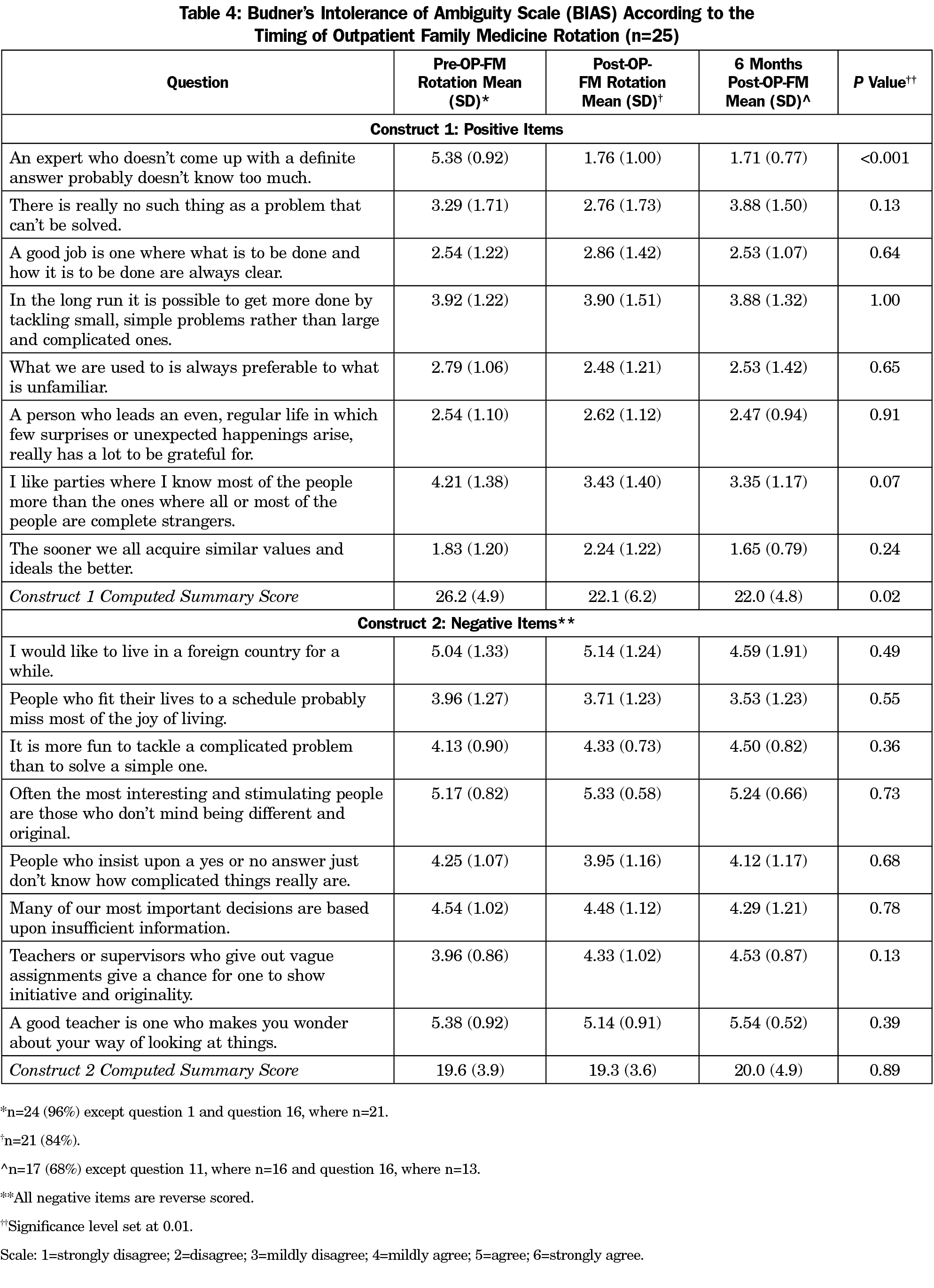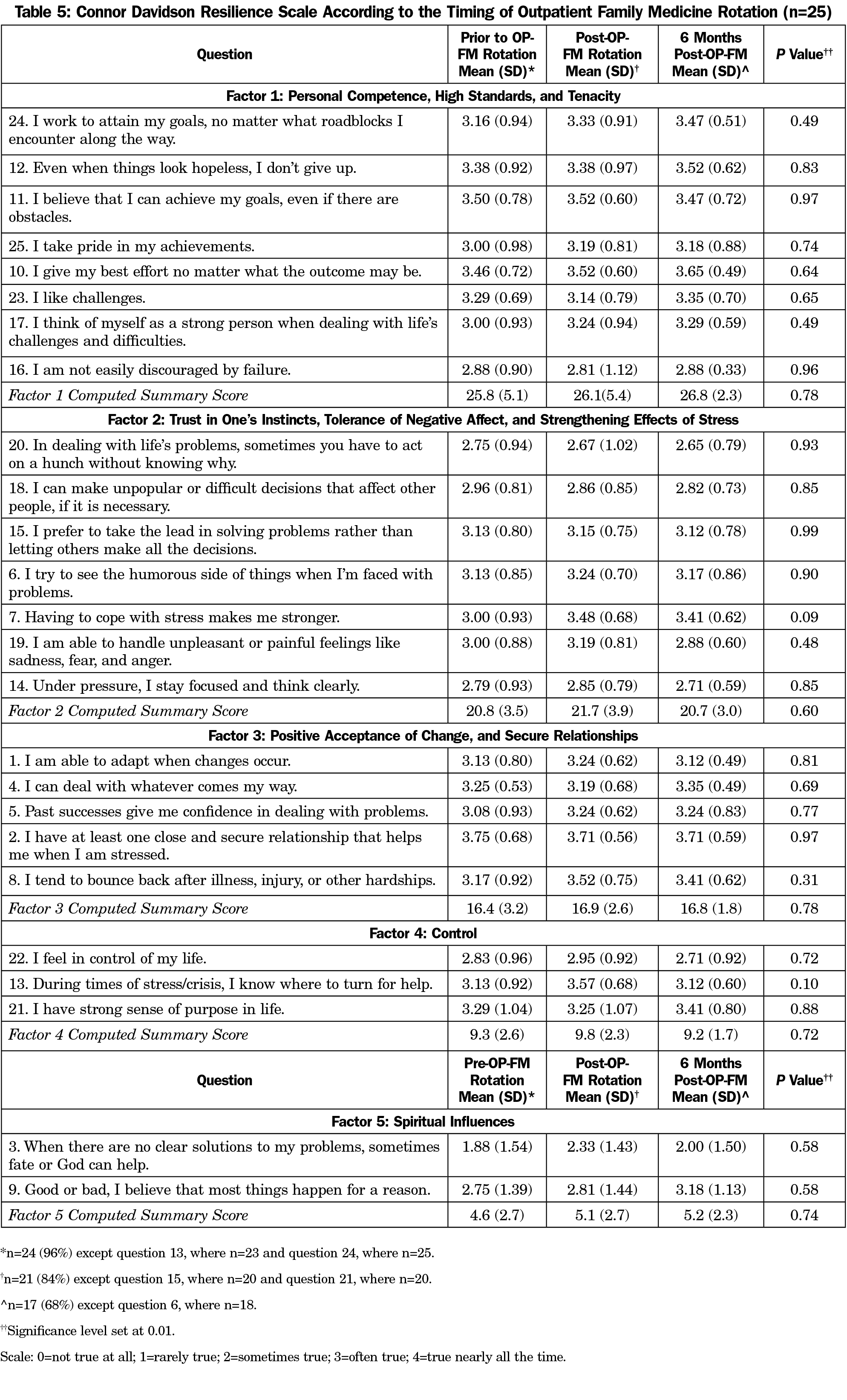 Table 4 shows one individual variable, and its corresponding construct score for the BIAS survey was statistically different according to timing of assessments. The variable, “An expert who doesn’t come up with a definite answer probably doesn’t know too much,” had a score of 5.38 prior to the rotation, which dropped to 1.76 immediately following it and remained the same (1.71) 6 months postrotation (P<0.001). In addition, Construct 1 (Positive Tolerance of Ambiguity) also showed borderline significant changes according to the timing of the OPFM-T with a score of 26.2 prior to the rotation, 22.1 immediately after the rotation, and 22.0 6 months after the rotation (P=0.02). Table 5 shows individual variable and construct scores for the CD-RISC survey were not statistically different pre- and postrotation.