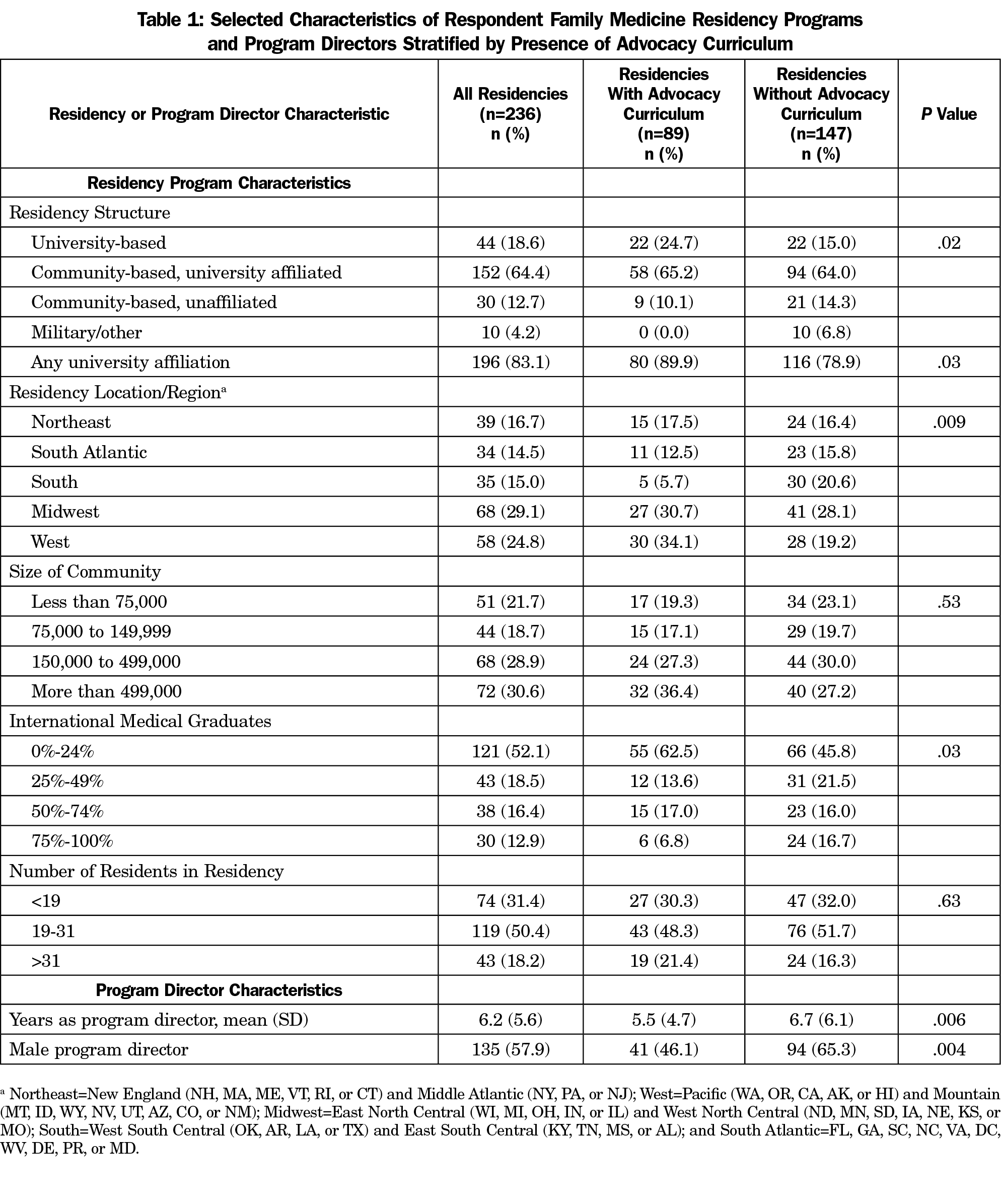 The response rate for the CERA survey was 54.6% (261/478), of which 90.4% (236/261) completed all questions of the advocacy module, creating an overall response rate of 49.4% (236/478). PD respondents (Table 1) were reflective of the expected structure and location of ACGME-accredited residencies (not presented). The majority of residencies (64.4%, 152/236) were community-based/university-affiliated residencies.