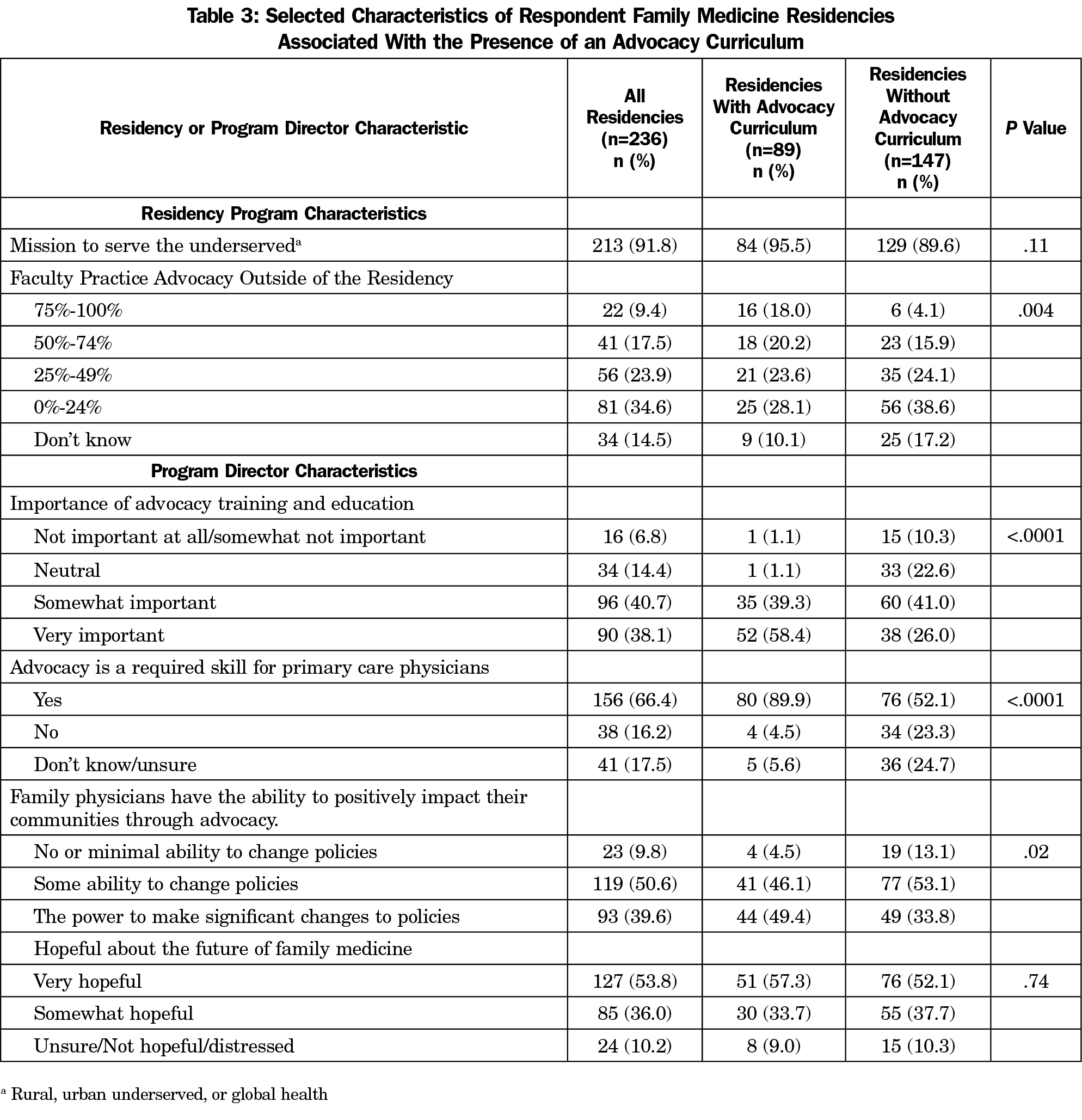 Methods: Questions about residency advocacy curricula, residency characteristics, and program director (PD) attitudes toward family medicine and advocacy were included in the 2017 Council of Academic Family Medicine Educational Research Alliance (CERA) survey of family medicine residency PDs. We used univariate and bivariate statistics to describe residency characteristics, PD attitudes, the presence of a formal advocacy curriculum, and the relationship between these.