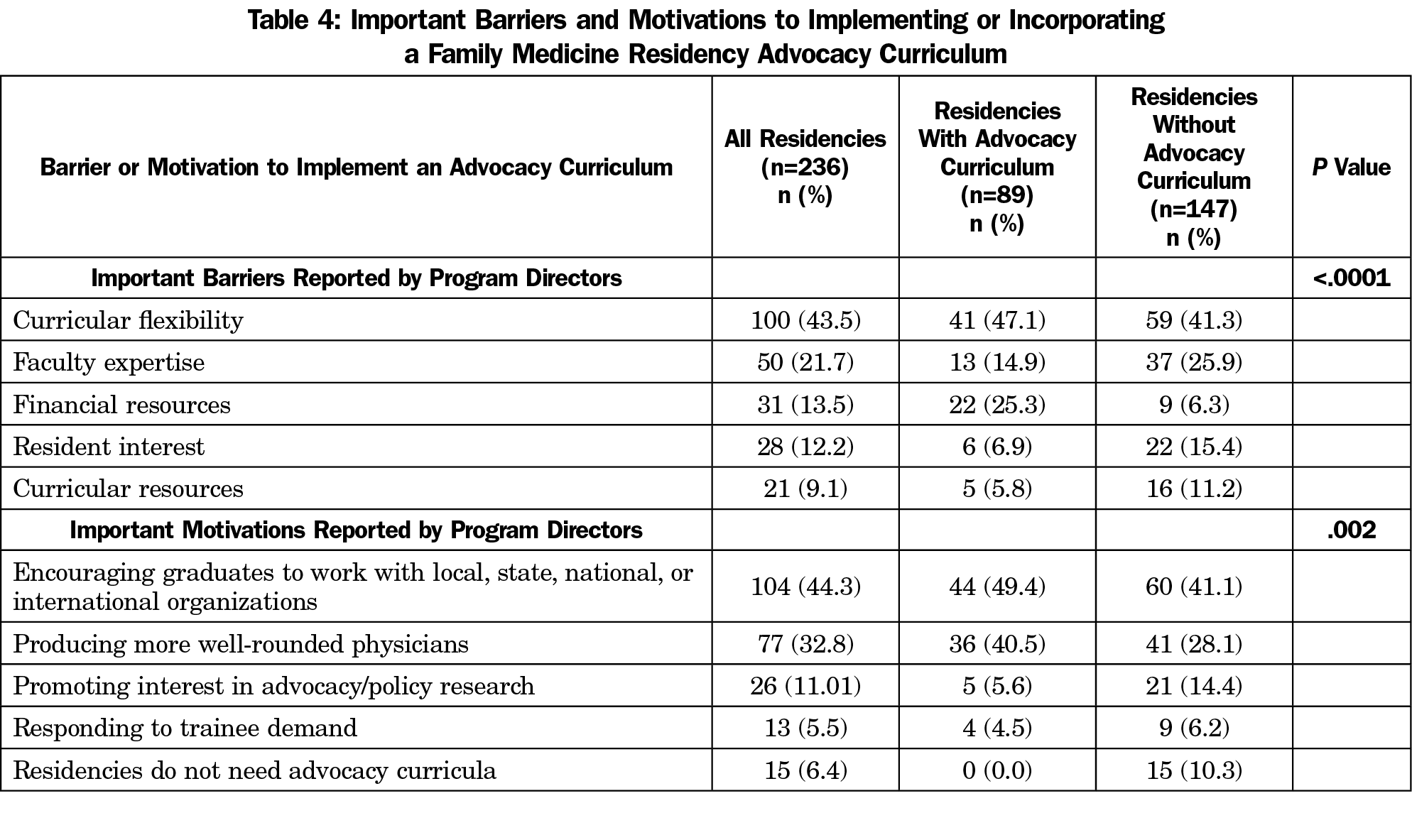 The most significant barrier cited was curricular flexibility (43.5%, 100/236; Table 4) followed by faculty expertise (21.7%, 50/236). Respondents without an advocacy curriculum were more likely to cite the need for more faculty expertise and curricular resources, compared to residencies with an already-established curriculum, who cited financial restrictions (P<.001). Residencies were most motivated to include advocacy curricula to encourage graduates to work with local, state, national or international officials or organizations (44.3%, 104/236) and produce more well-rounded physicians (32.8%, 77/236).