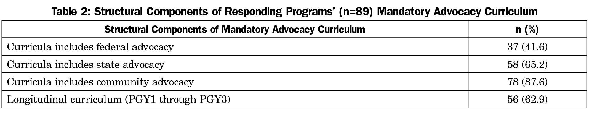Of the 236 PDs who answered all questions of the advocacy module, 89 (37.7%) reported a formal, mandatory advocacy curriculum (Table 2). Among residencies with advocacy curricula, fewer had federal advocacy components (41.6%, 37/89) than compared to state (65.2%, 58/89) or community (87.6%, 78/89) components. Curricula most often took place longitudinally over 2 years or more (83.1%, 74/89) with the majority over 3 years (62.9%, 56/89). Of residencies without a formal advocacy curriculum, 87.8% (129/147) were able to refer interested residents to optional elective opportunities.