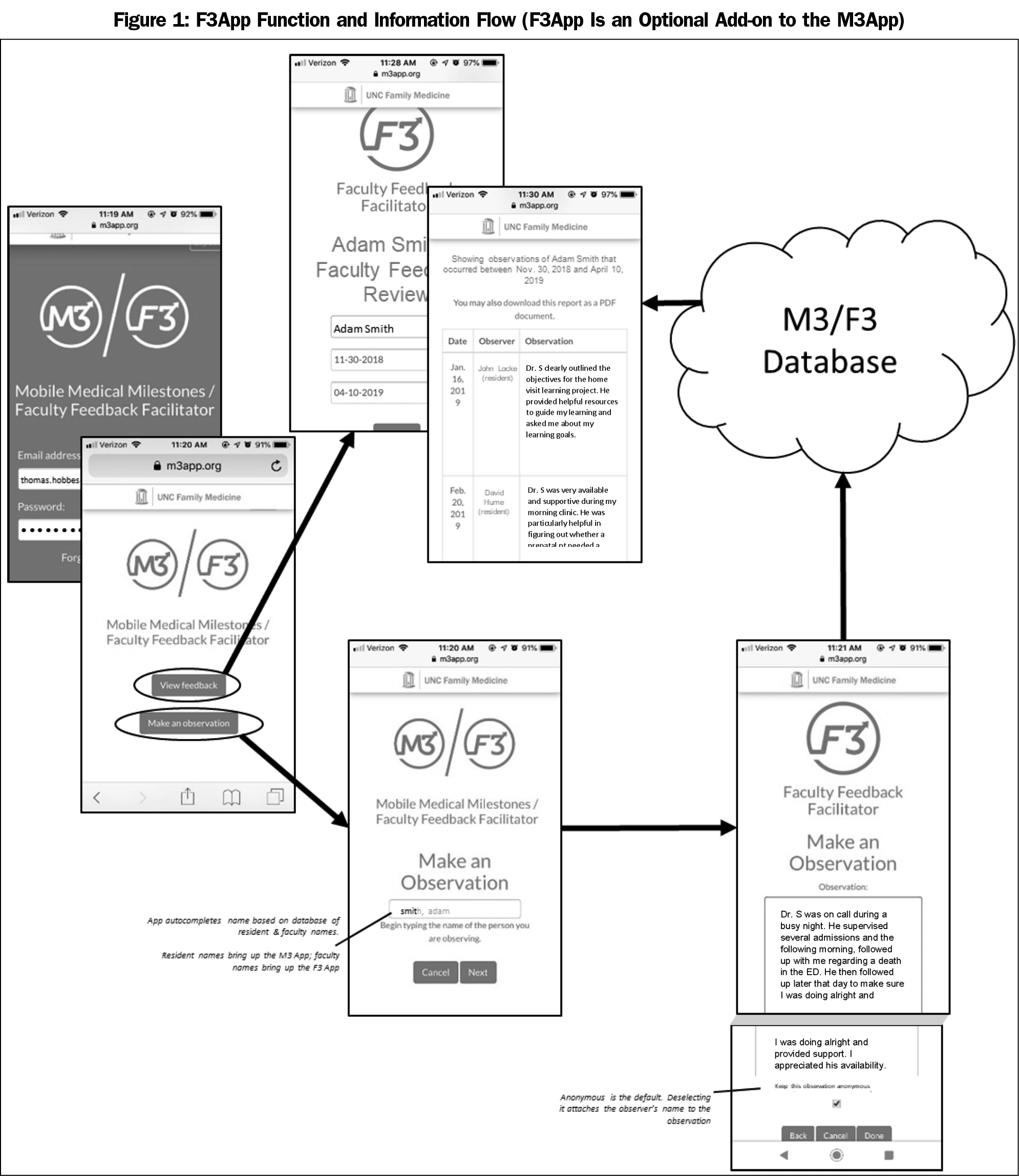 In 2014, we developed the Mobile Medical Milestones (M3App), which allows faculty and peers to record narrative observations of learner behavior.16 In 2017, we developed the companion app, F3App, which allows learners and peers to record narrative observations of faculty. F3App was produced by an external contractor, then alpha tested by the Department of Family Medicine at the University of North Carolina at Chapel Hill. Figure 1 illustrates components of the app.