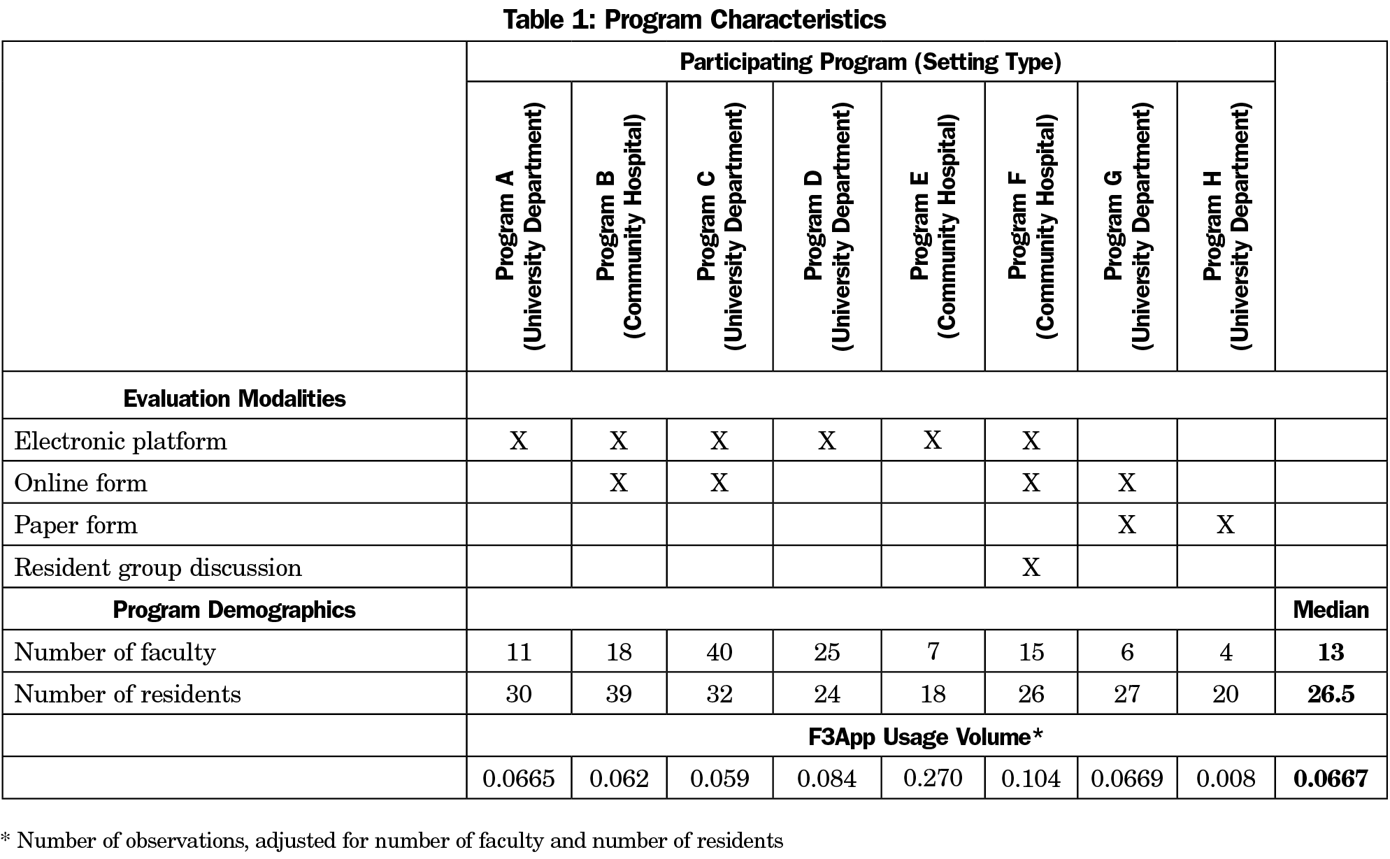 All eight PDs responded to both pre- and postimplementation surveys. Of 126 faculty members, 99 (79%) responded to the preimplementation survey and 82 (65%) responded postimplementation. Of 216 residents, 152 (70%) and 101 (47%) respectively responded to pre- and postimplementation surveys. Program characteristics, including setting, teaching evaluation modalities, size, and F3App usage volume are shown in Table 1.