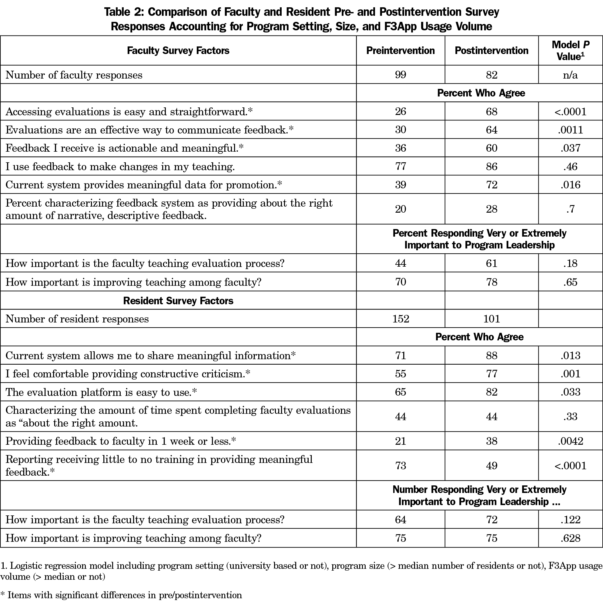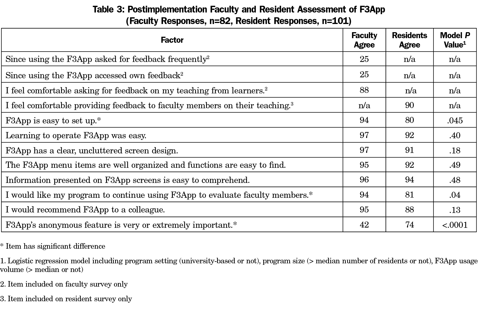Results: Survey results showed significant postimplementation increases in faculty agreement that accessing evaluations is easy (42%), evaluations are an effective way to communicate feedback (34%), feedback is actionable and meaningful (24%), and the current system provides meaningful data for promotion (33%). Among residents, agreement that the current system allows meaningful information sharing and is easy to use increased significantly, by 17% each. The proportion of residents agreeing they were comfortable providing constructive criticism increased significantly (22%). PDs generally reported that residents were receptive to using the F3App, found it quick and easy to use, and that feedback provided was meaningful.