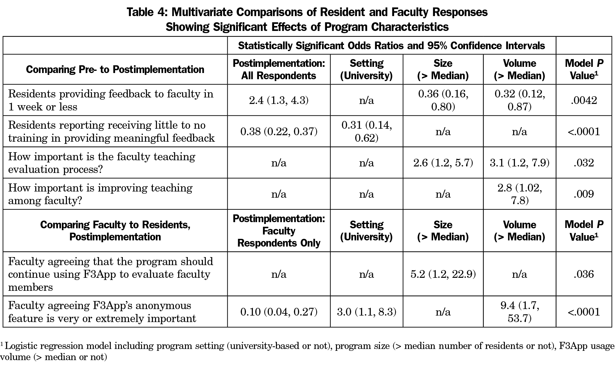Among residents, agreement that the current system allows meaningful information sharing and is easy to use, as well as the proportion who reported providing feedback to faculty in a week or less increased significantly (each by 17%), independent of program setting, size, and app use volume. The proportion agreeing they were comfortable providing constructive criticism increased significantly (22%) and the proportion of residents who reported receiving little or no training in providing meaningful feedback decreased significantly (24%). Residents’ perception of the importance to program leadership of the teaching evaluation process or on improving faculty teaching did not differ significantly from pre to post. Nor was there any significant difference in the proportion of residents responding that the time spent on faculty evaluations was about right.