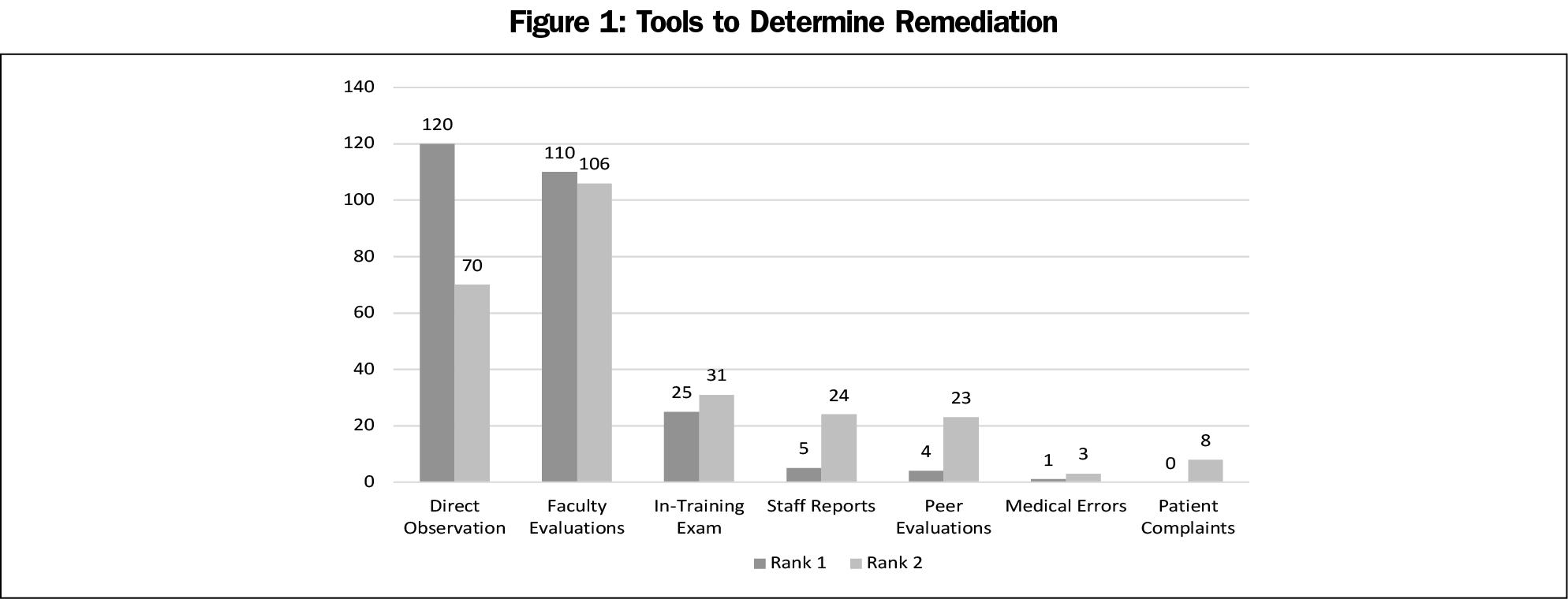 The main challenges to remediation were the lack of documented evaluations to trigger or guide remediation (22%) and a lack of faculty knowledge of and skills with effective remediation strategies (22%, Table 4). Program directors identified direct observations (45% ranked it first) and faculty evaluations (40% ranked it first) as the top two tools to determine remediation (Figure 1).