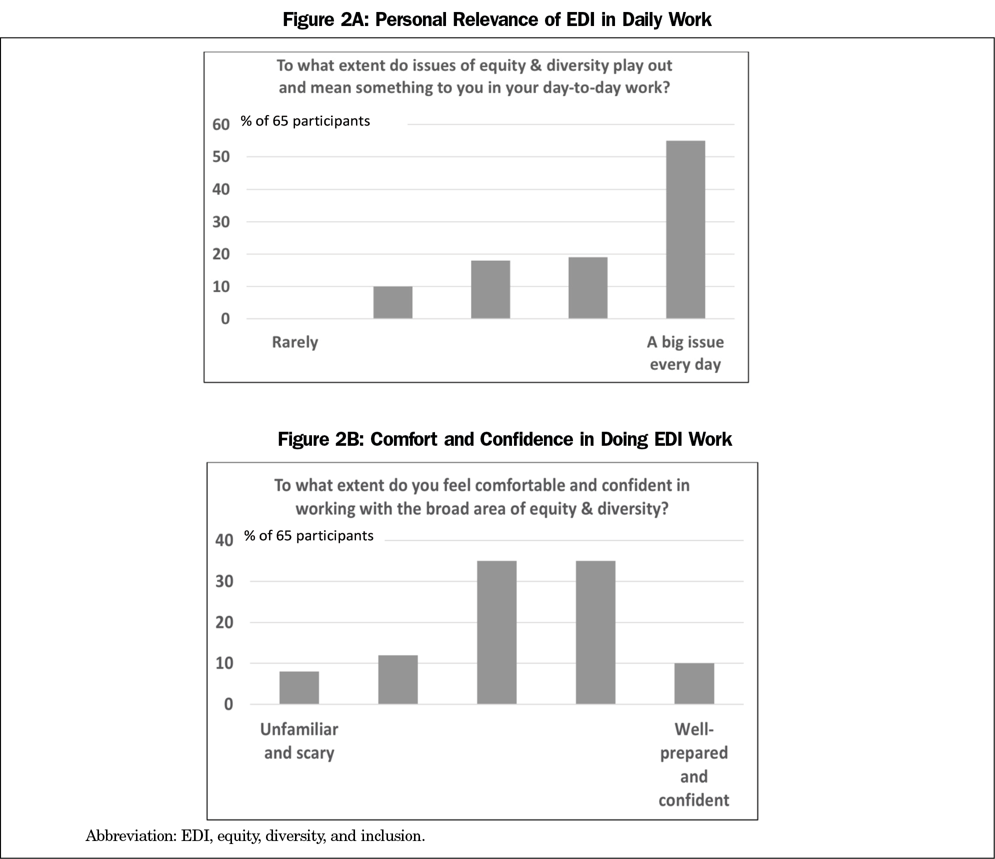Then a clicker poll asked for the relevance of EDI in daily work, along with individual comfort, confidence in addressing EDI (Figures 2A, 2B). This showed EDI as a big issue in daily work and a wide range of comfort and confidence with addressing it. People were relieved to see this all this out in plain view, grounded in local reality, as they moved into table work to identify the department’s top growth areas and actions to take.