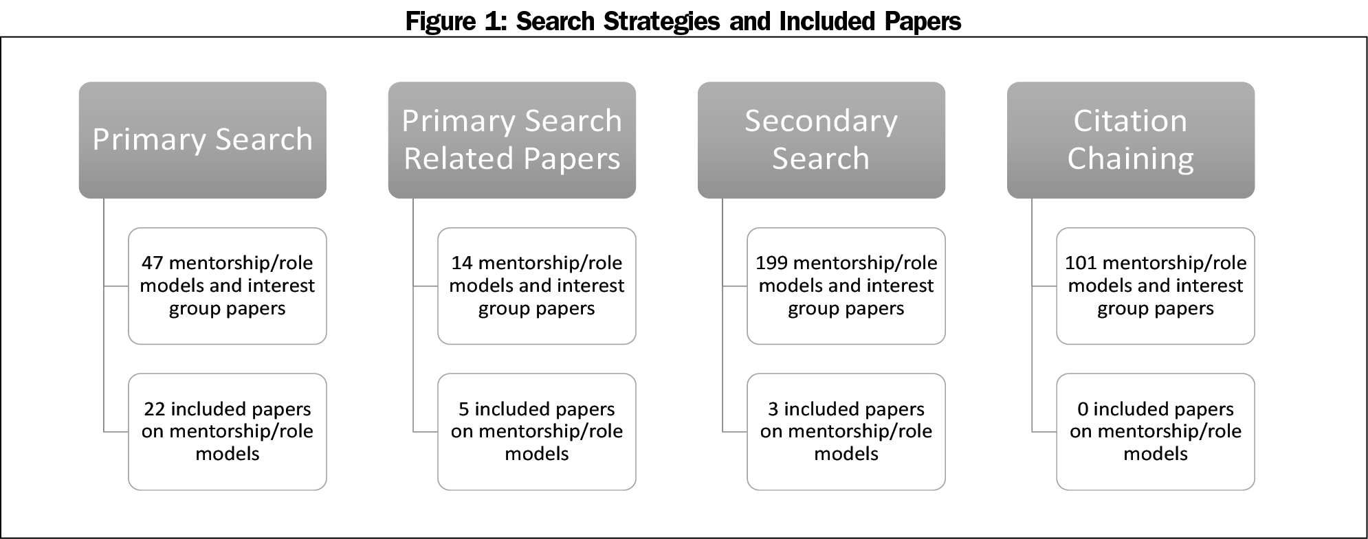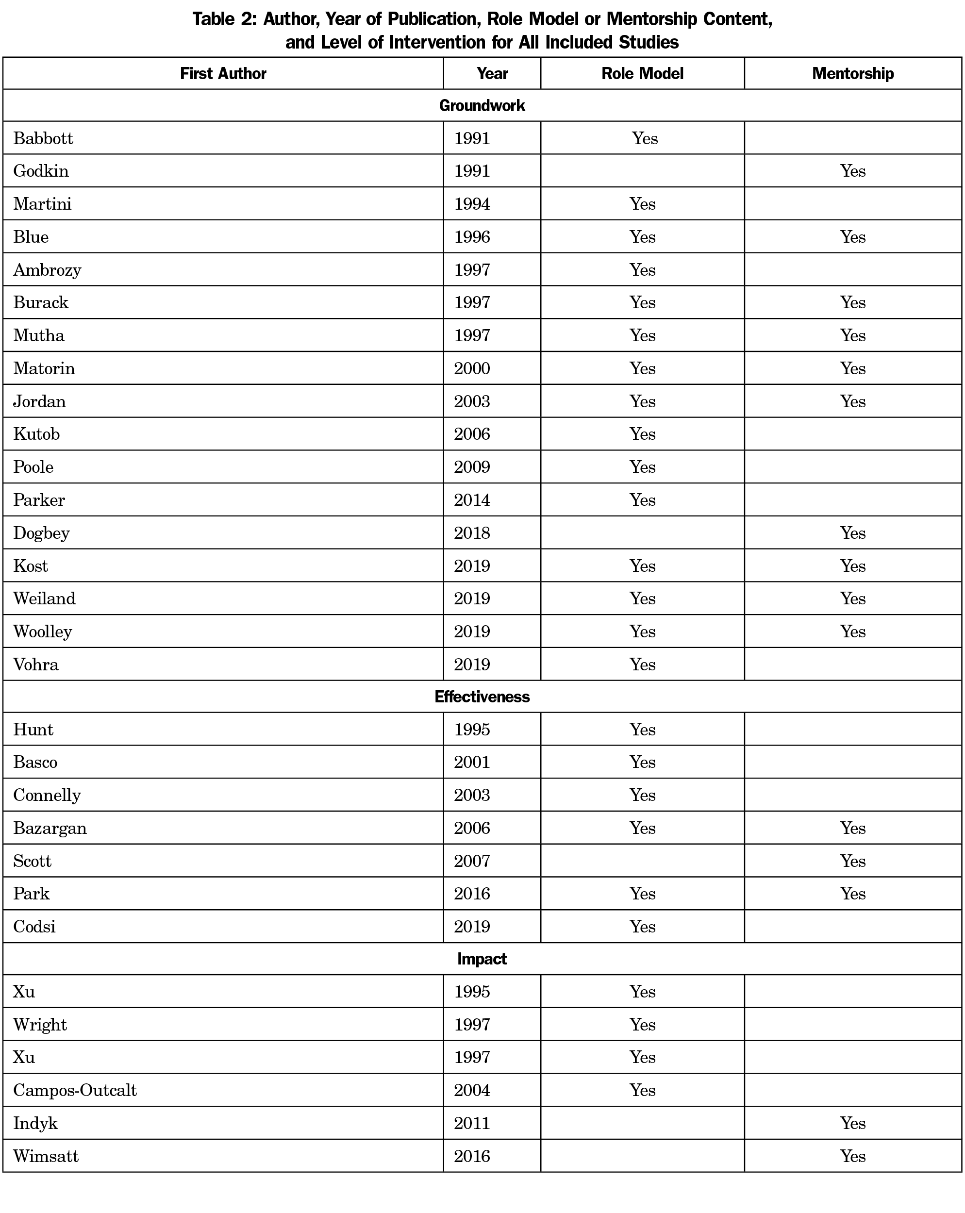 Strengths of our study include the systematic nature of the review and the inclusion of work over 30 years. Categorizing the interventions by groundwork, effectiveness, and impact increases understanding of the existing literature and informs future directions.5 Limitations of this study include a lack of search of the grey literature. The search did not include databases such as Cochrane, OVID, MEDLINE, and PsychInfo. This study is limited to role modeling and mentorship. It did not explore advising and similar concepts. Future directions should include multi-institutional studies that investigate the impact of role modeling and mentoring on students’ actual entry into primary care practice.