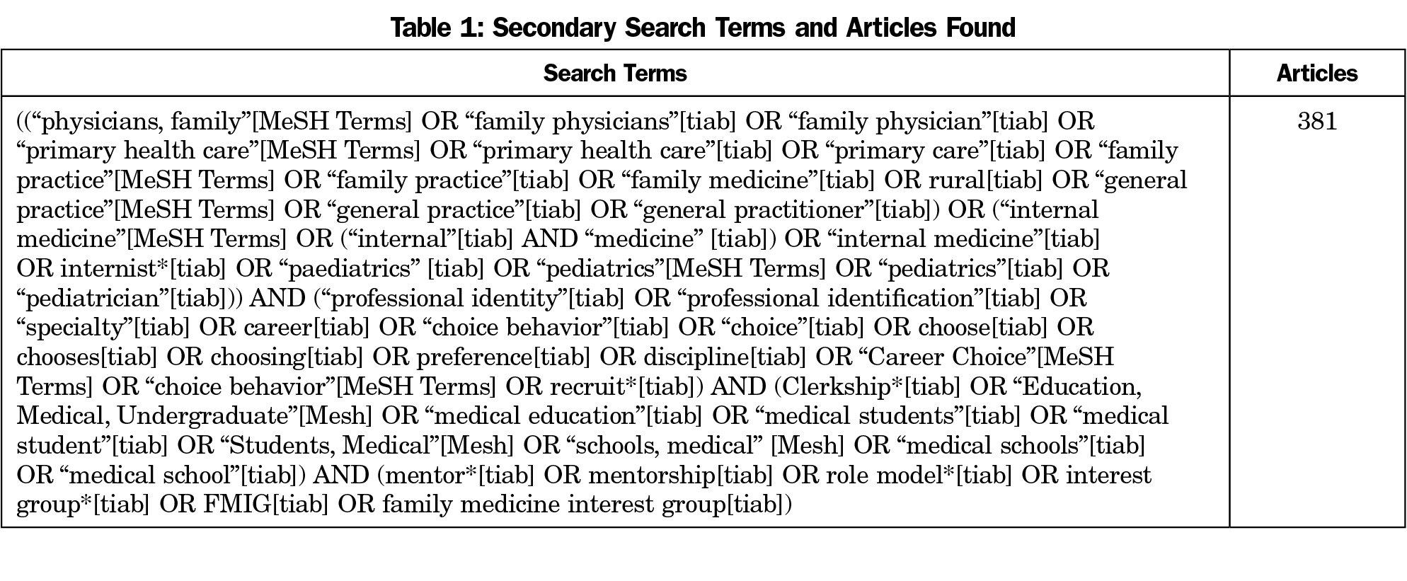 A language mapping process identified key secondary search terms (Table 1) focused on role models and mentoring. Student-run free clinics, and family medicine interest groups were also included in this secondary search and those findings are reported in a separate paper.6 We conducted this search of PubMed, Scopus, and CINAHL on April 13, 2021. This secondary search resulted in 199 additional topic-specific articles.