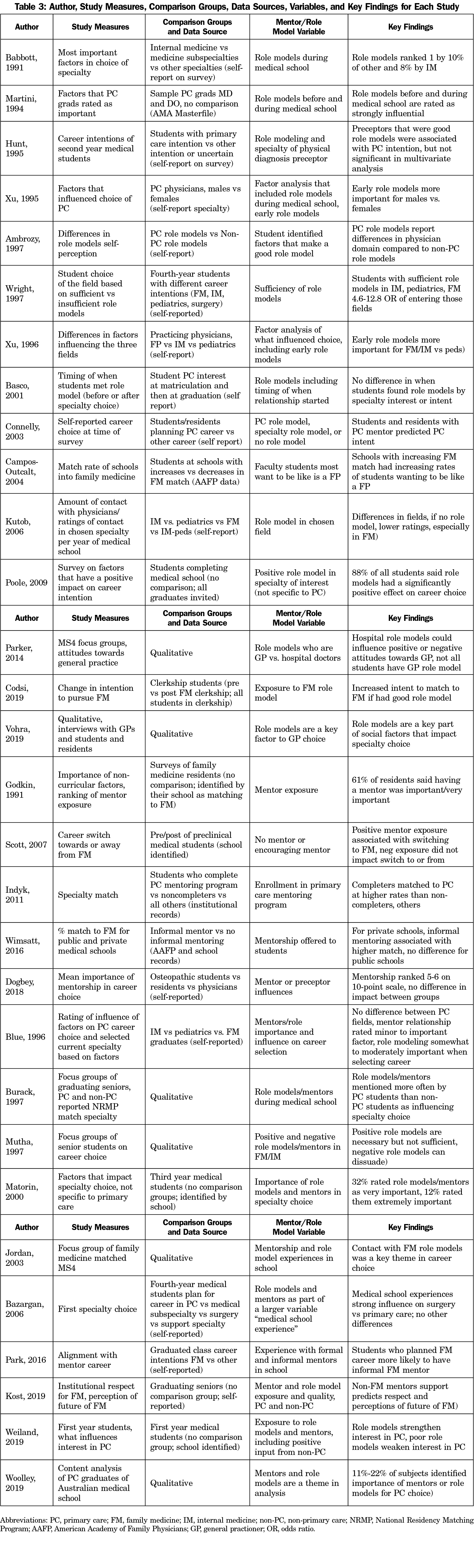 - Articles examined the influence of role models/role modeling or mentors/mentorship in undergraduate medical education on primary care specialty choice,