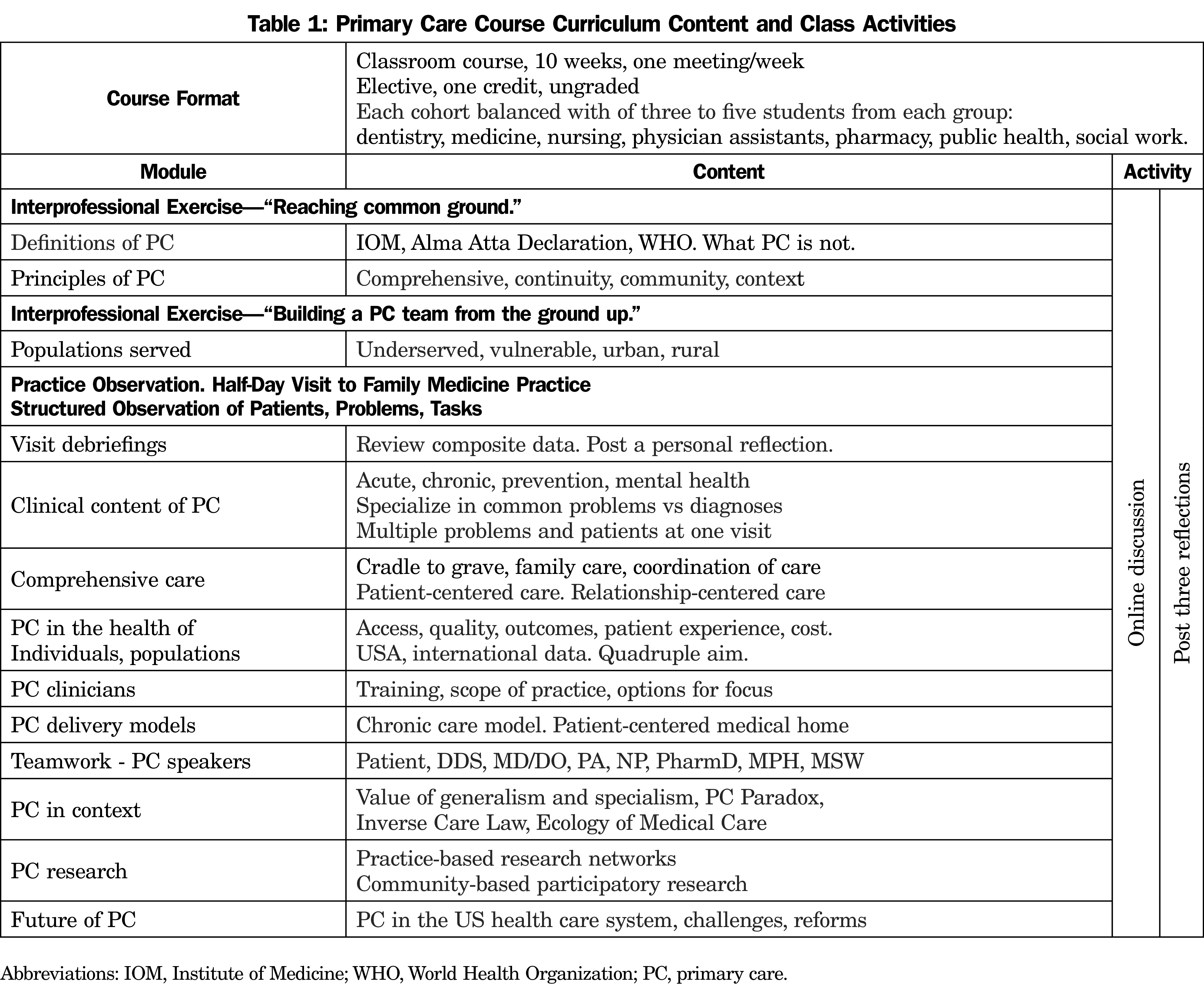 Our Primary Care Course (PCC) is a simple, flexible, low-cost classroom elective.11 Taught from a family medicine foundation, this interprofessional course engaged learners at all levels across seven health professional schools: dentistry, medicine, nursing, physician assistants, pharmacy, public health, and social work.