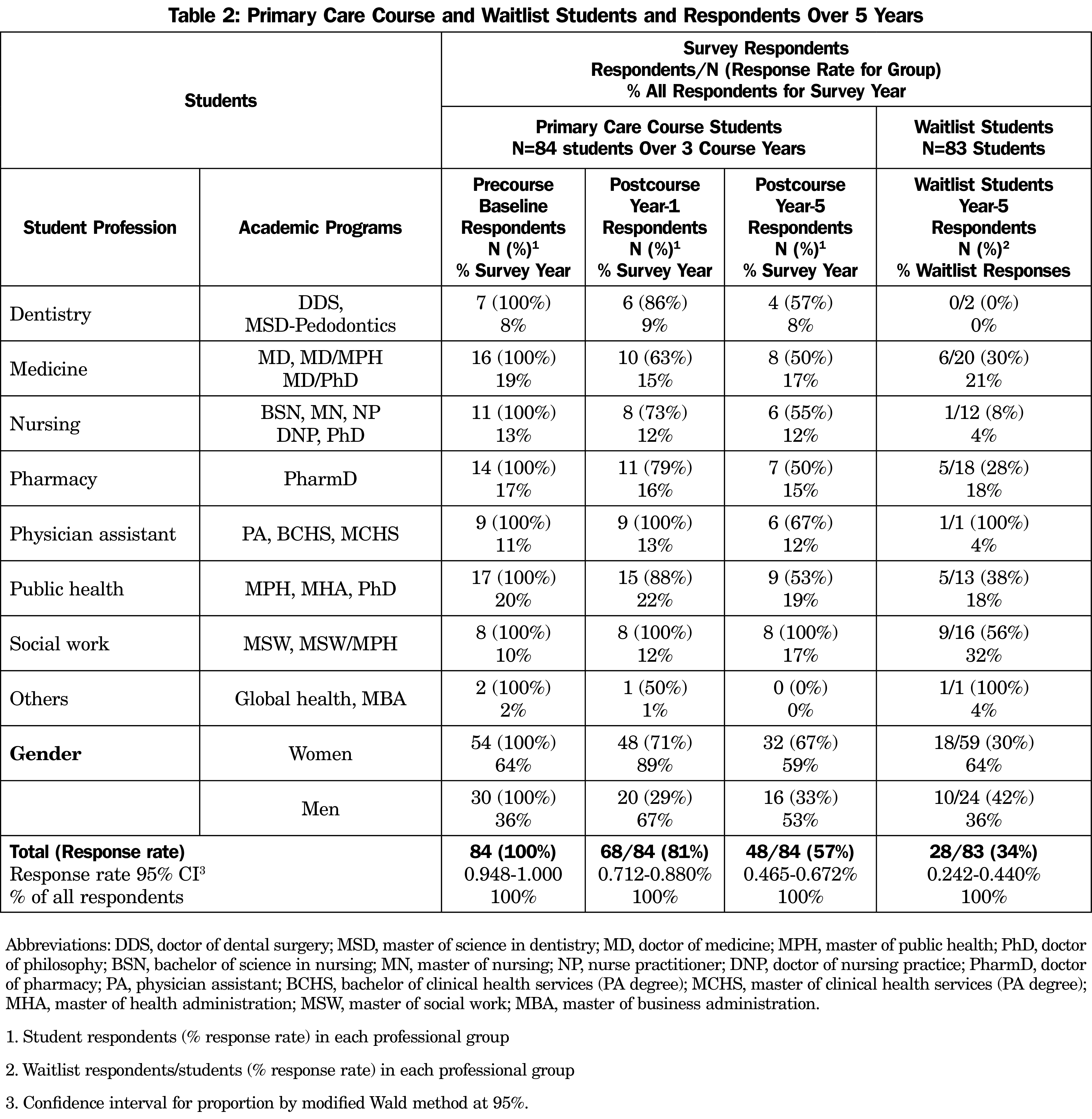 Our PCC student survey response rates were 100% (84) at baseline, 81% (68/84) at year 1, and 57% (48/84) at year 5 (Table 2). Waitlist response rate was 34% (28/83) overall and included all groups (range 8%-100%) except dentistry.