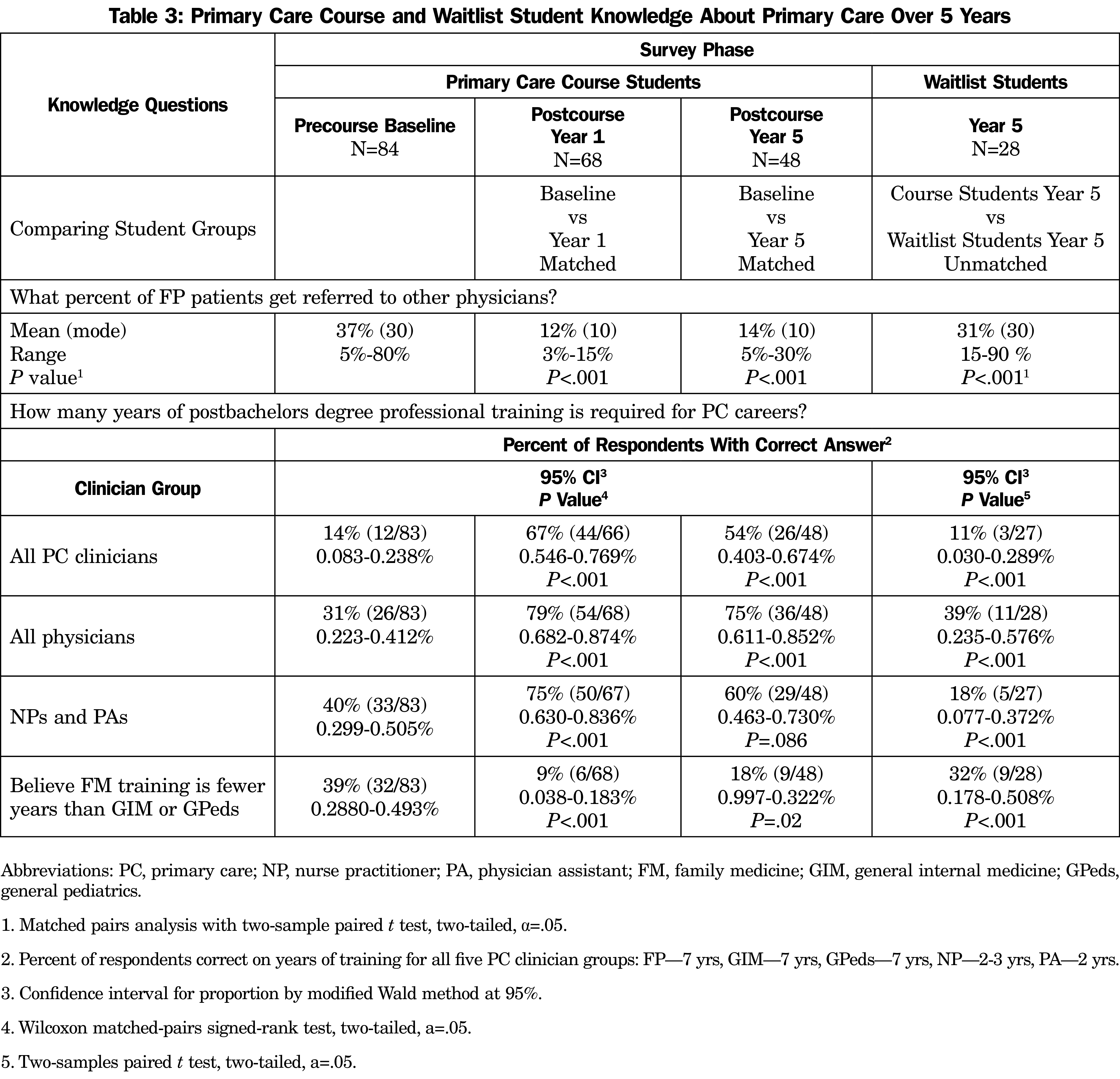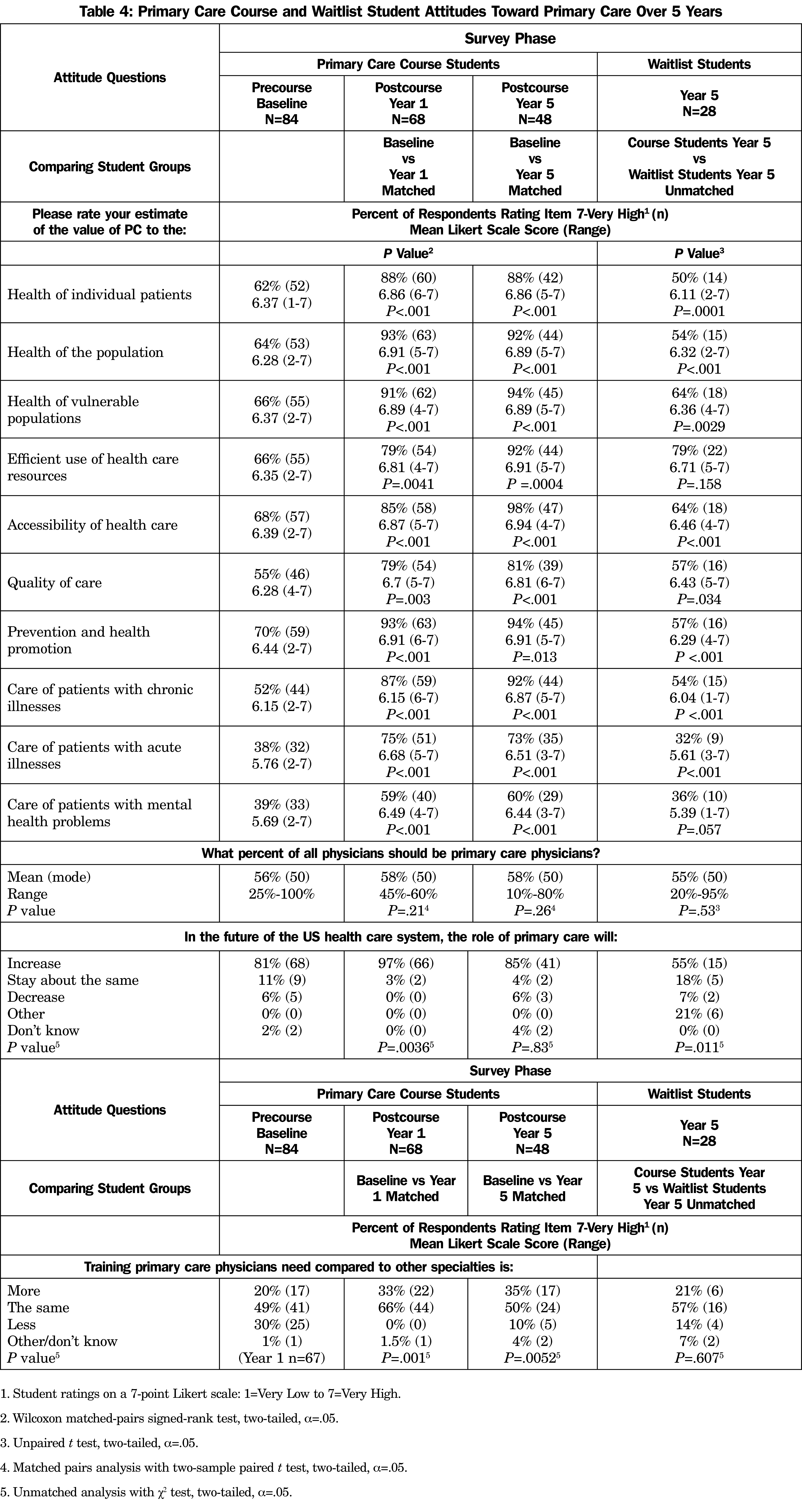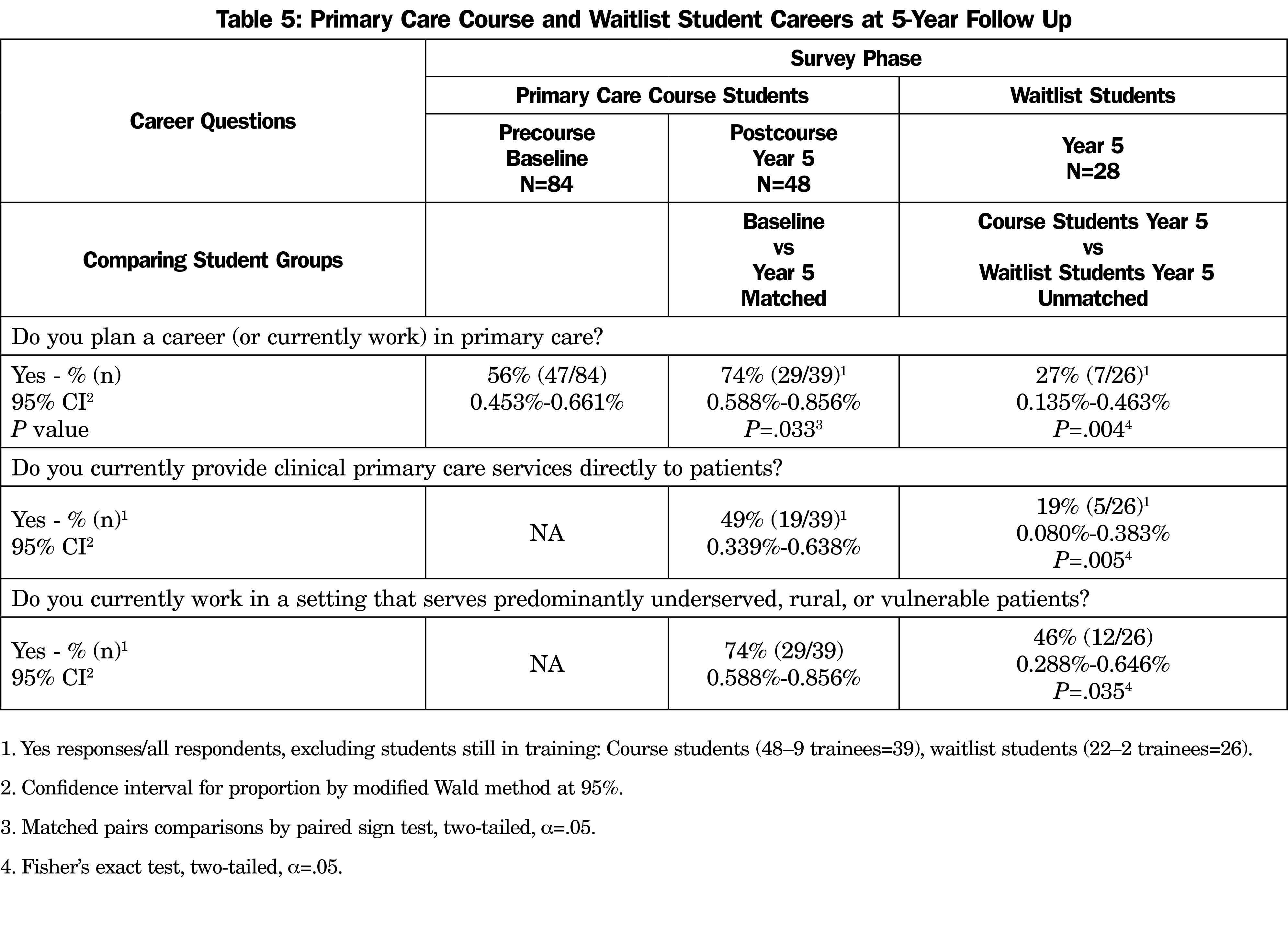 Results: Surveys yielded responses from 100% (84) at baseline, 81% (68) at 1 year, 57% (48) at 5 years, and 34% (28/83) among waitlist students at year 5. Before-and-after matched pairs analyses documented significant increases at year 1, sustained through year 5, in knowledge of PC training and referral patterns and attitudes toward PC value and role in future US health care. Precourse, 56% of students planned PC careers. At year 5, PCC graduates reported working in PC (74%, 29/39), delivering direct PC patient care (48%, 19/39), and working with underserved communities (74%, 29/39). The PC knowledge and attitudes of waitlist students at year 5 were similar to PCC student baseline scores and were significantly lower at year 5. Only 27% (7/26) of waitlist students reported working in PC at year 5.