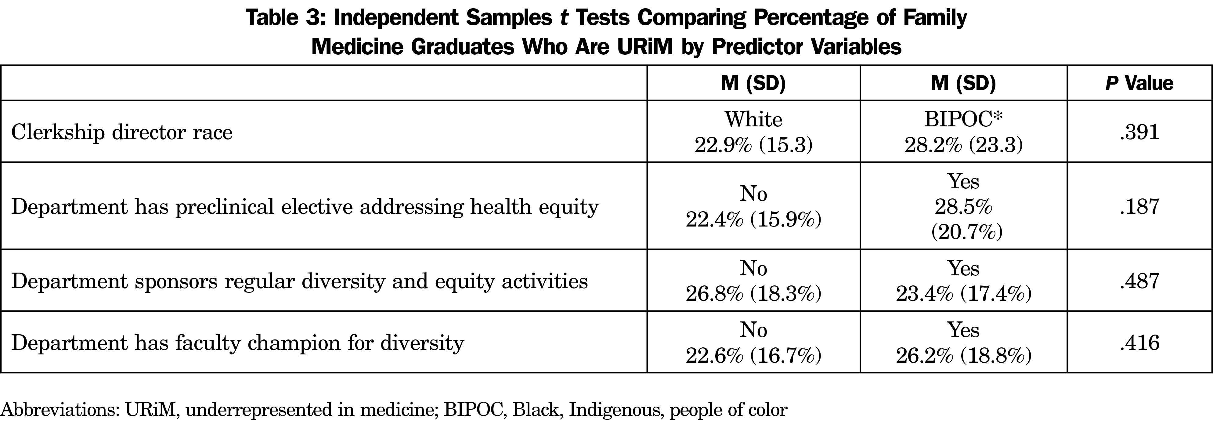 Bivariate correlations determined associations between the percent URiM faculty (Pearson correlation), percent URiM preceptors, percent clerkship cases addressing health equity (Spearman rank order correlations), and the percent of URiM students choosing family medicine residencies. t tests determined associations between clerkship director race (White vs Black, Indigenous, People of Color), preclinical electives on health equity (yes vs no), department faculty champion for diversity (yes vs no), and department diversity activities (eg, faculty development, book club, invited lectures; yes vs no); and the percent of URiM students choosing family medicine residencies.