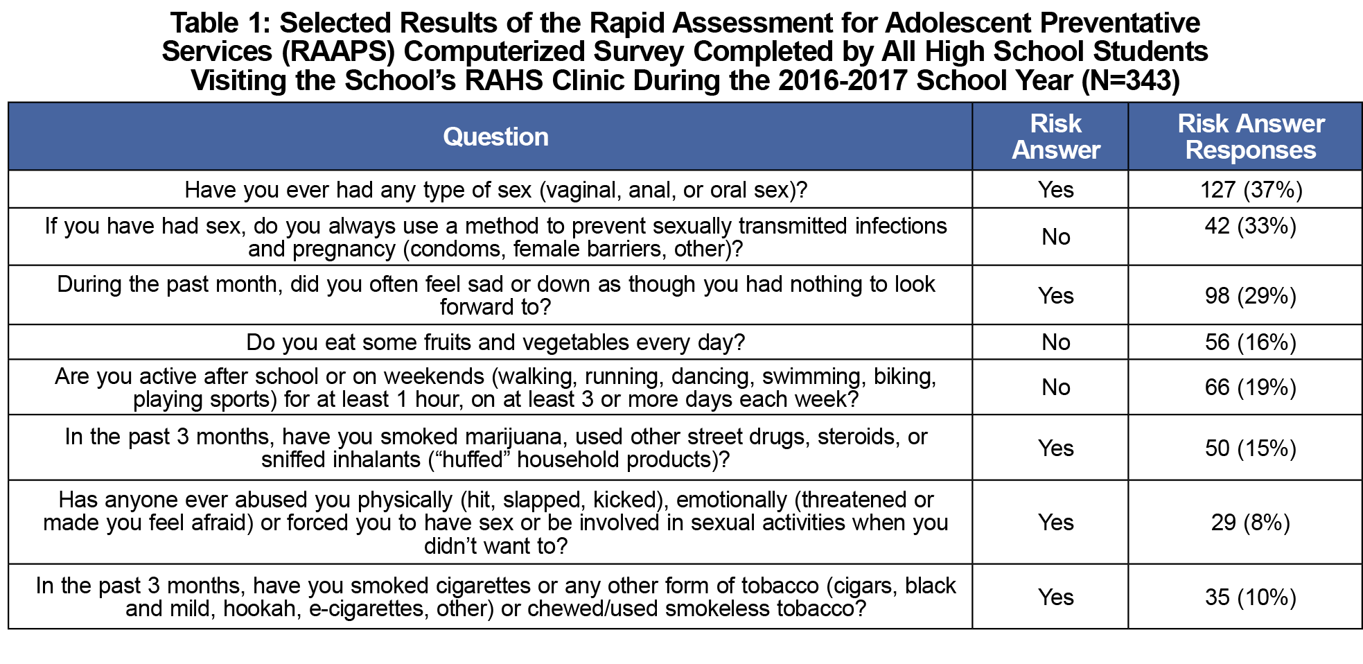 A high school in Washtenaw County, MI was chosen as the pilot site due to its population of economically disadvantaged students (41% received free or reduced lunch in 2016-2017)9 and its participation in the Regional Alliance for Healthy Schools (RAHS), a network of school-based clinics run by Michigan Medicine (MM). The school requires all students to take a one-semester health course, offered during four class periods each semester. Baseline risk behavior of the student body was gathered through the Rapid Assessment for Adolescent Preventive Services (RAAPS), a survey for high-risk behaviors completed yearly by each student visiting the school’s RAHS clinic (Table 1).