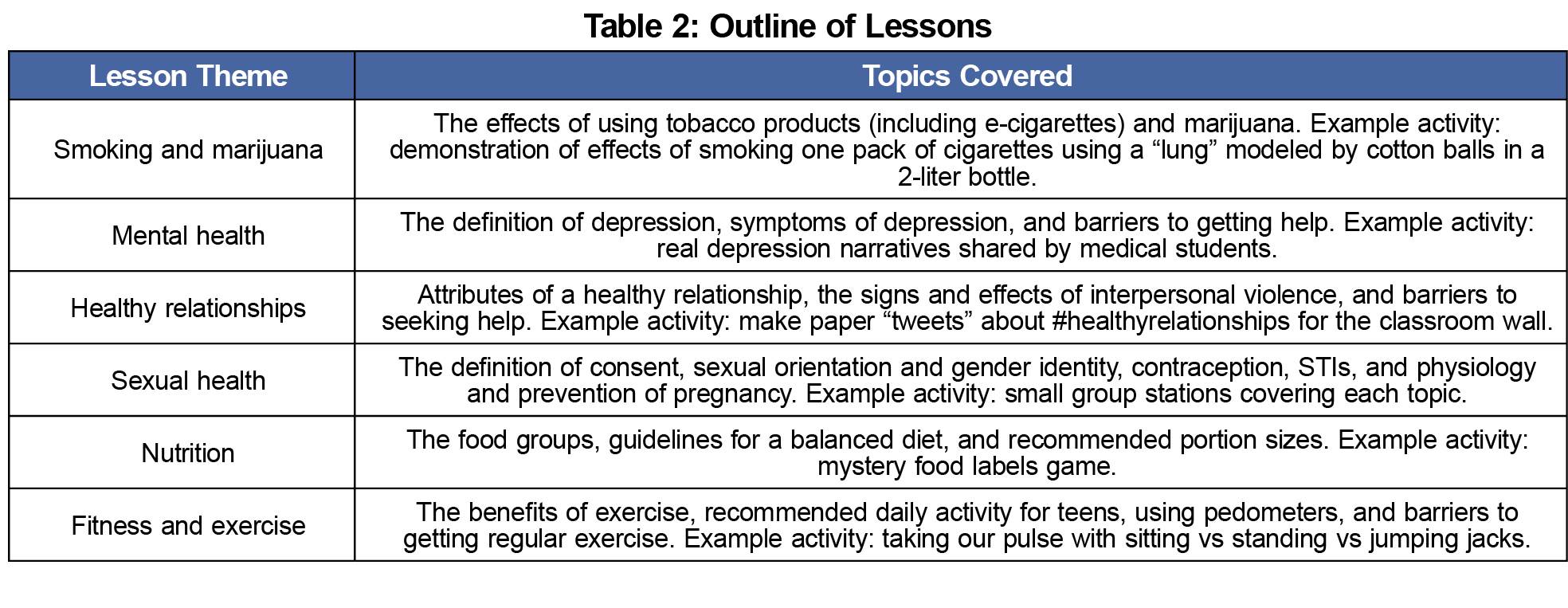 Using RAAPS-identified areas of highest risk behavior, medical students created six 60-minute lessons with the themes sexual health, smoking and drugs, mental health, healthy relationships, nutrition, and fitness and exercise. Lessons focused on teaching through interactive, engaging learning activities (Table 2).