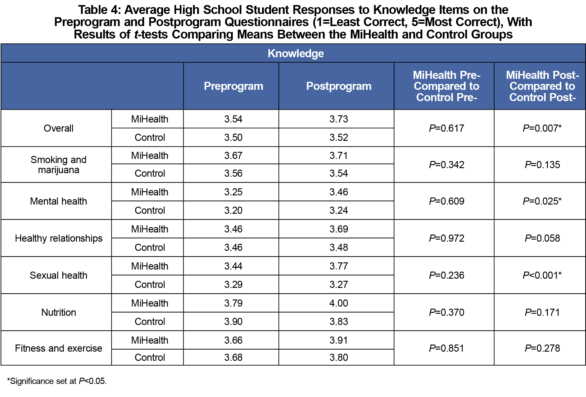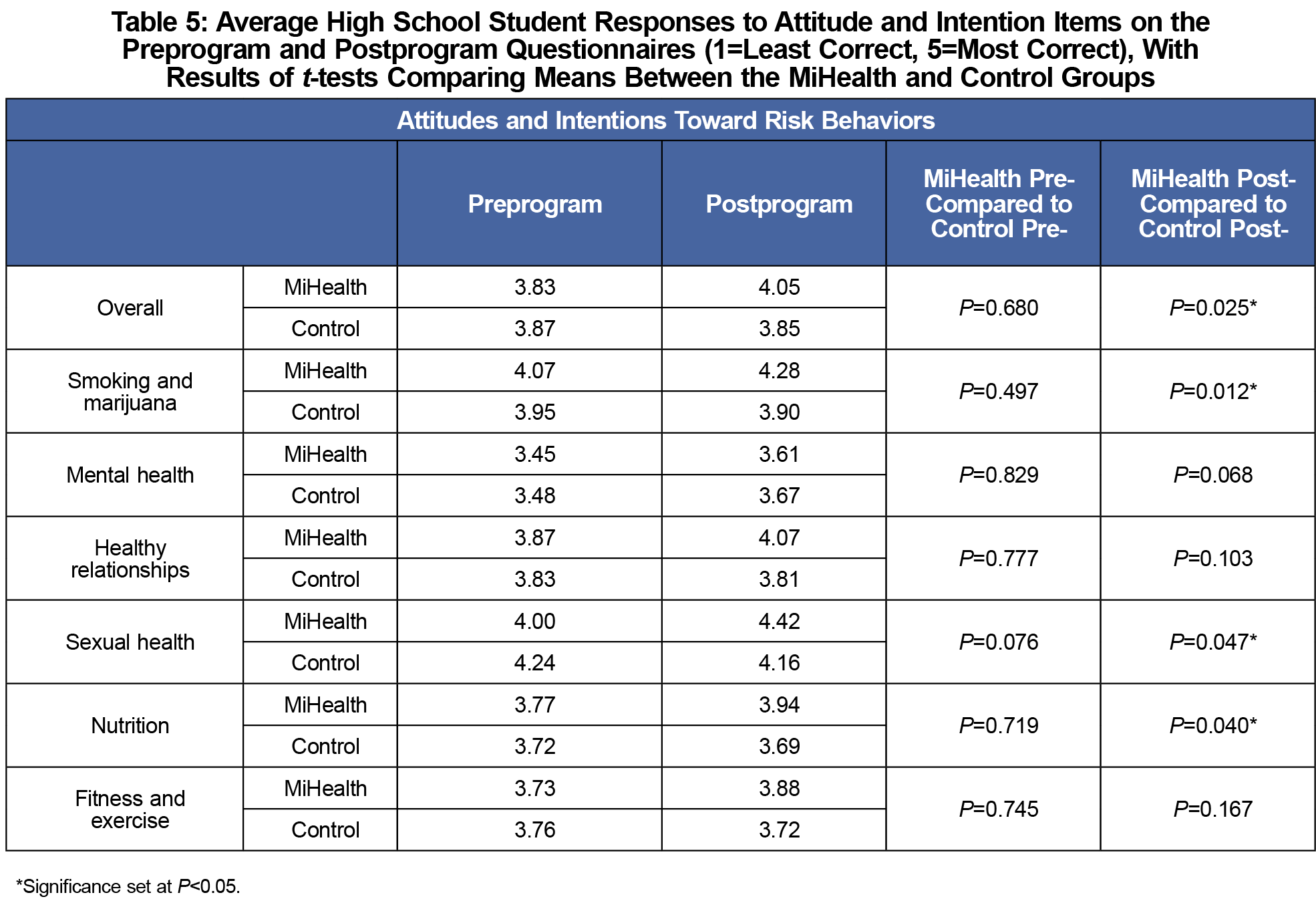 Results: Six weeks after program completion, high school students who received the MiHealth curriculum scored significantly higher on health knowledge (P=0.007), and expressed significantly healthier attitudes and intentions toward risk behavior compared to controls (P=0.025). Among individual themes, MiHealth resulted in significant knowledge gains in sexual health (P=0.001) and mental health (P<0.025), and significantly healthier attitudes regarding sexual health (P=0.047), nutrition (P=0.040), and smoking and marijuana (P=0.012).