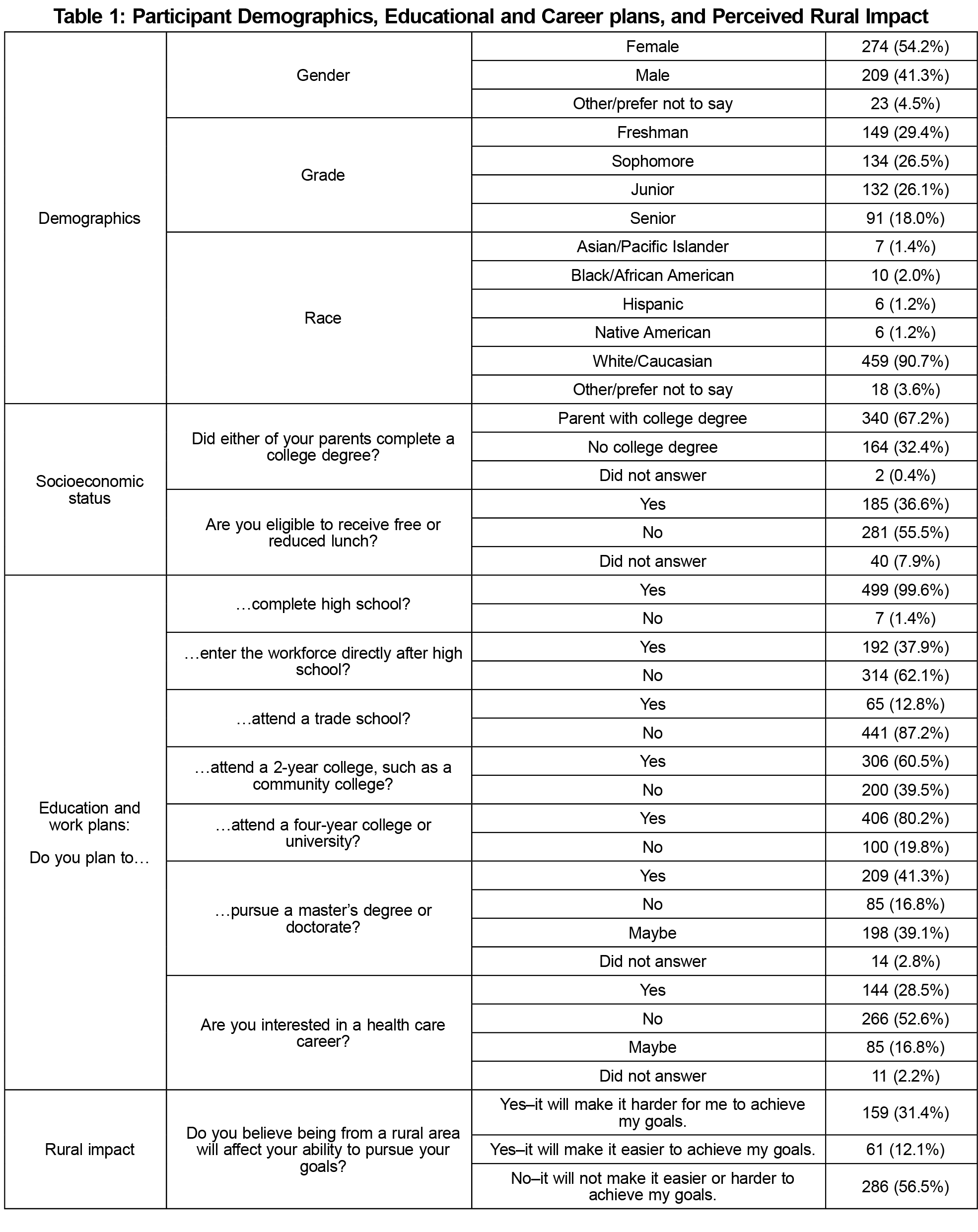 Introduction: Despite rural origin being a strong predictor of rural practice for health care professionals, rural students face educational barriers and are underrepresented in medical schools. The aim of this study was to identify rural high school students’ perceived barriers to college and health-related careers and compare whether perceptions were similar based on gender, socioeconomic status (SES), and parental education.
