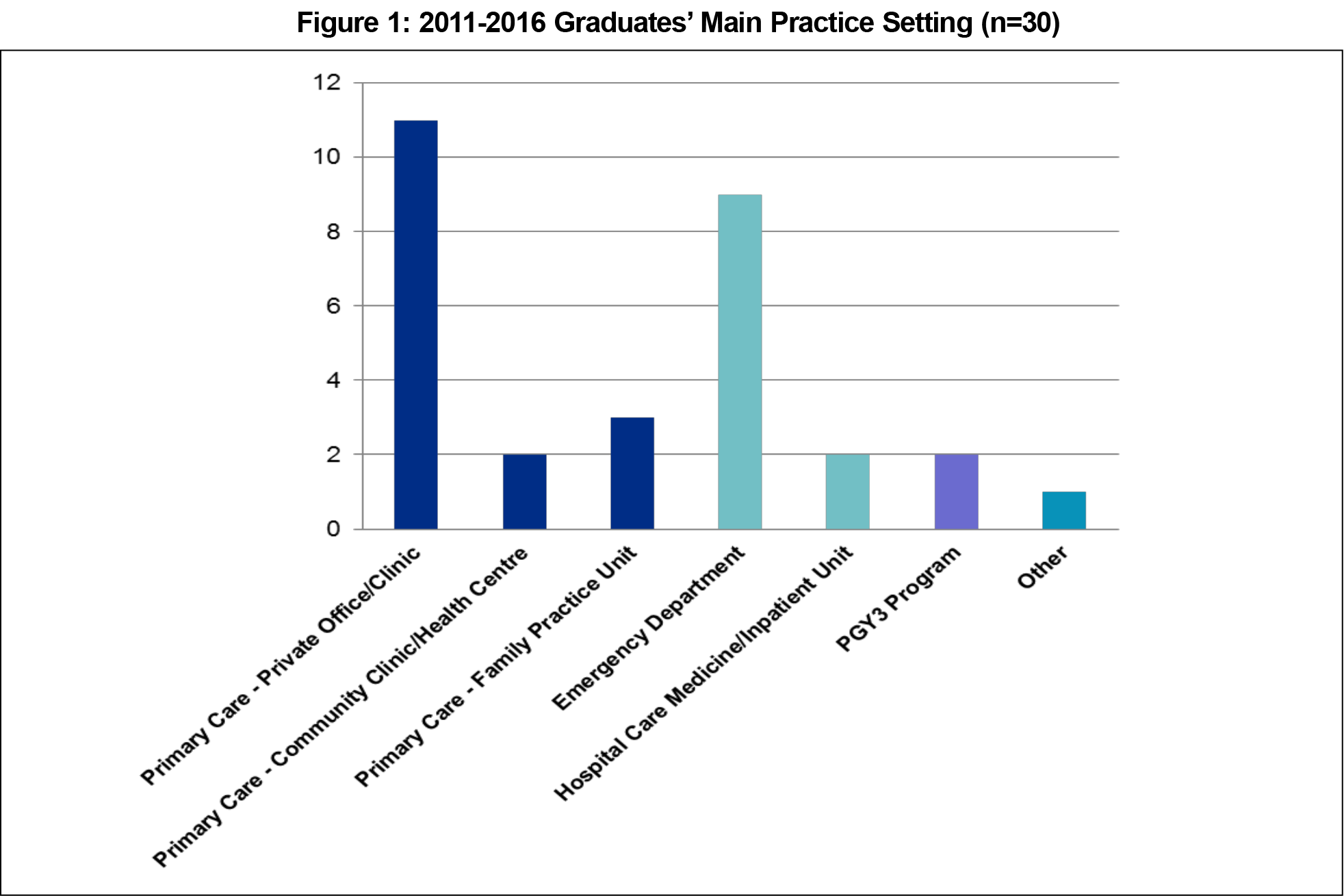 - Comprehensive primary care was being delivered by 53% of graduates; 37% worked primarily in a hospital setting (emergency room, medicine/inpatient unit), and 7% were in advanced family medicine training (Figure 1).