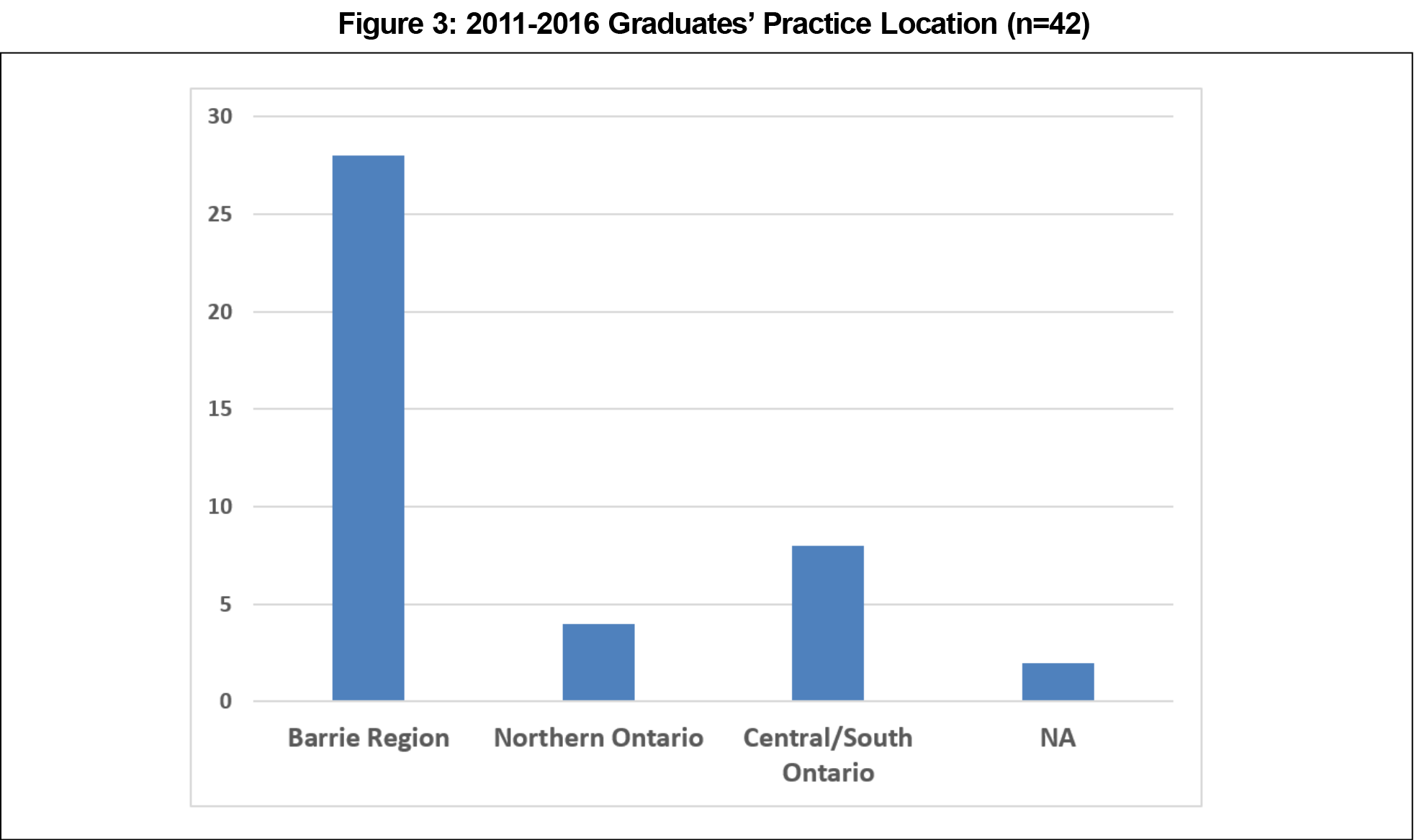 Next steps include longer-term tracking of graduates’ practice location to see whether they stay in Barrie long-term. Our findings suggest that establishing a new community hospital-based FMRP affiliated with an academic university program provides a strong mechanism to recruit physicians and improve access to family physicians in underserved areas. Further studies are needed to build upon these findings.