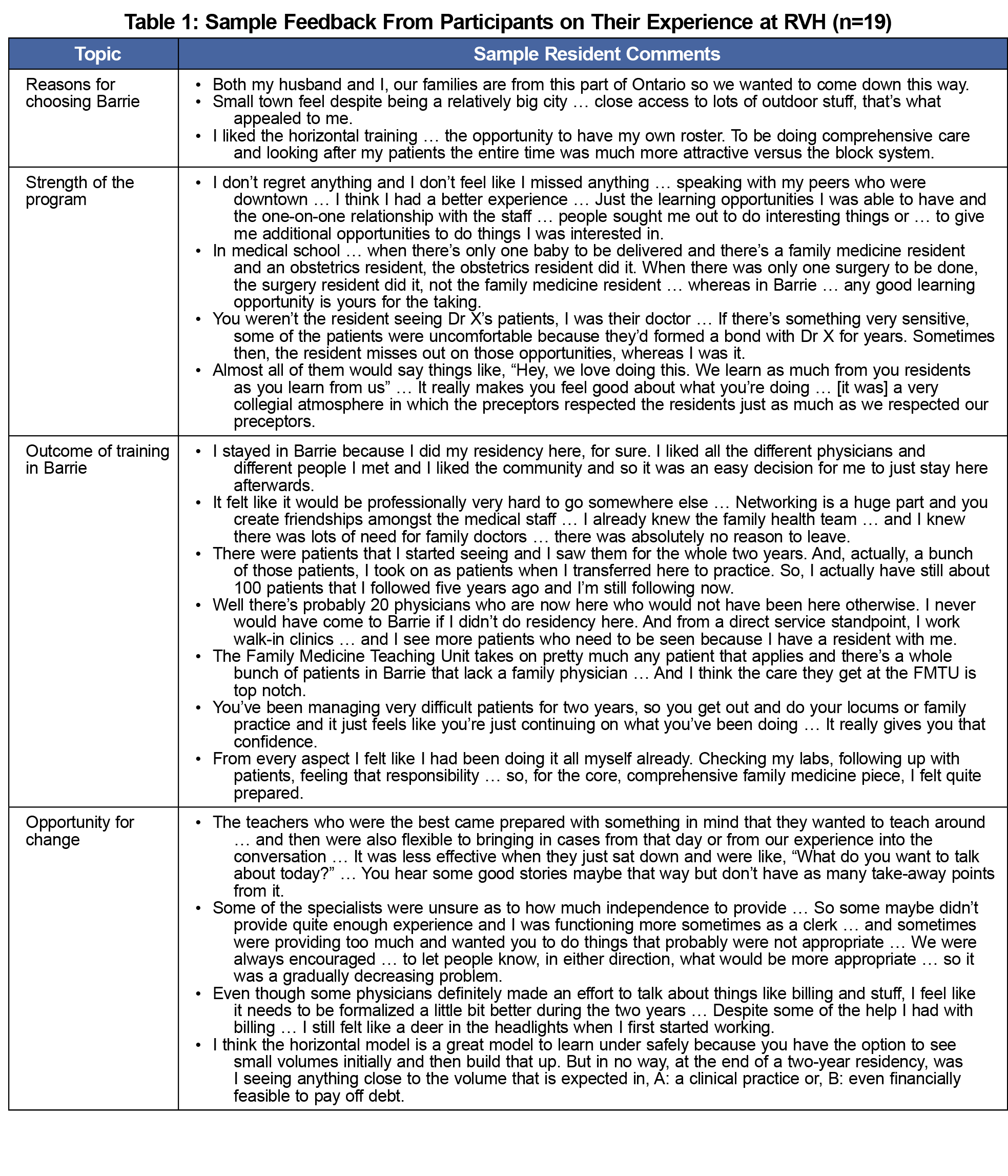 Data analysis provided insights into an overwhelmingly positive educational experience with a wide range of learning opportunities, participants’ reasons for choosing to train in Barrie and/or to stay and practice in Barrie, and some areas were identified for improvement (Table 1).