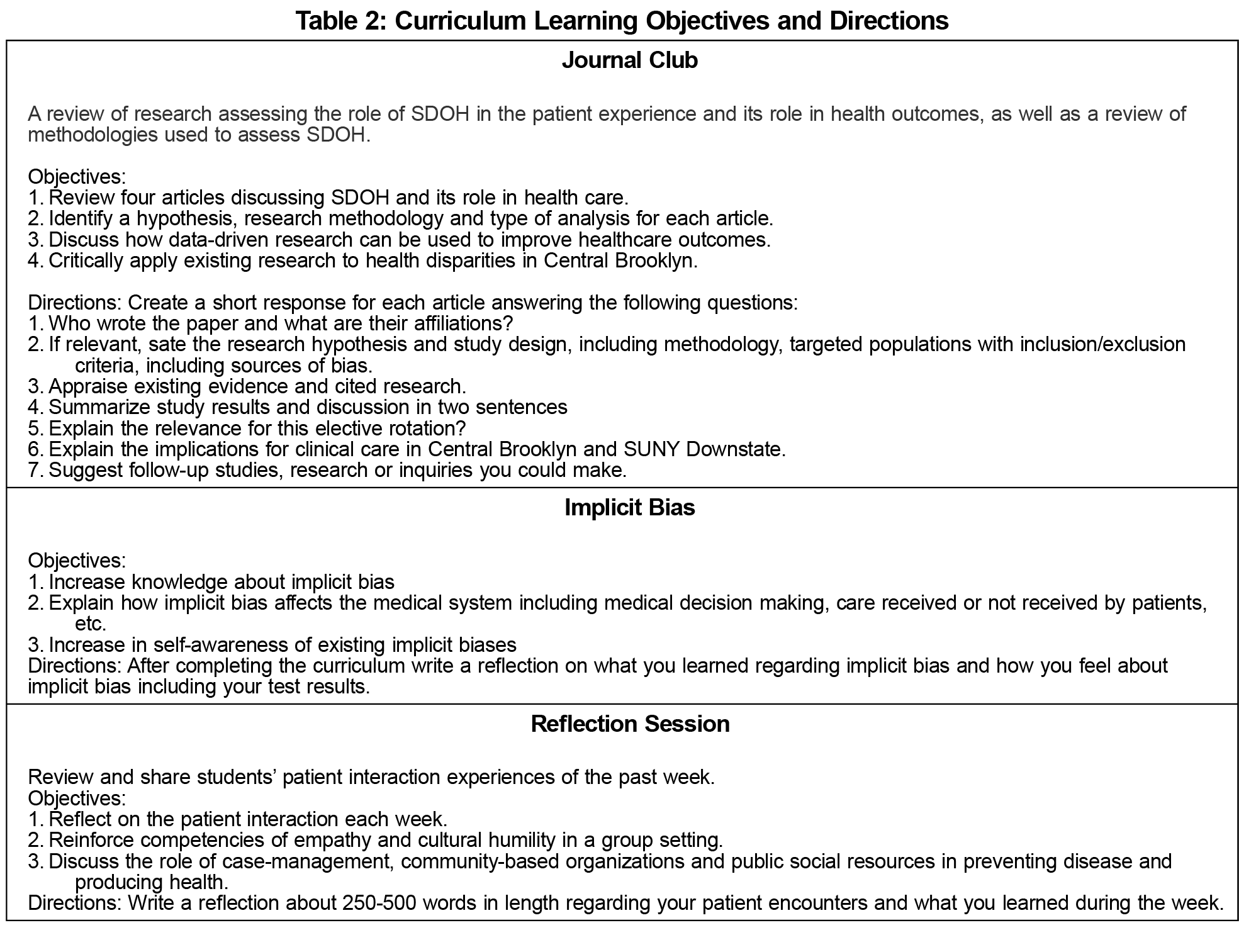 We organized the elective into weekly sections. Each week began with a journal club session, followed by implicit bias training and ending in individual and group reflection sessions. Using the flipped classroom and service-learning models, we first provided students readings that help establish foundational knowledge on relevant clinical trends as well as the skills necessary to provide competent care to underserved communities. These competencies were reinforced by patient interactions and interactive implicit bias trainings. To bring closure, each week ended with reflective sessions where an open, supportive learning environment allowed students to organically crystallize important lessons from the week and share them with the group. We based the learning objectives of the didactic components on faculty review of student reflections, allowing the student experience to play a central role in curriculum building.