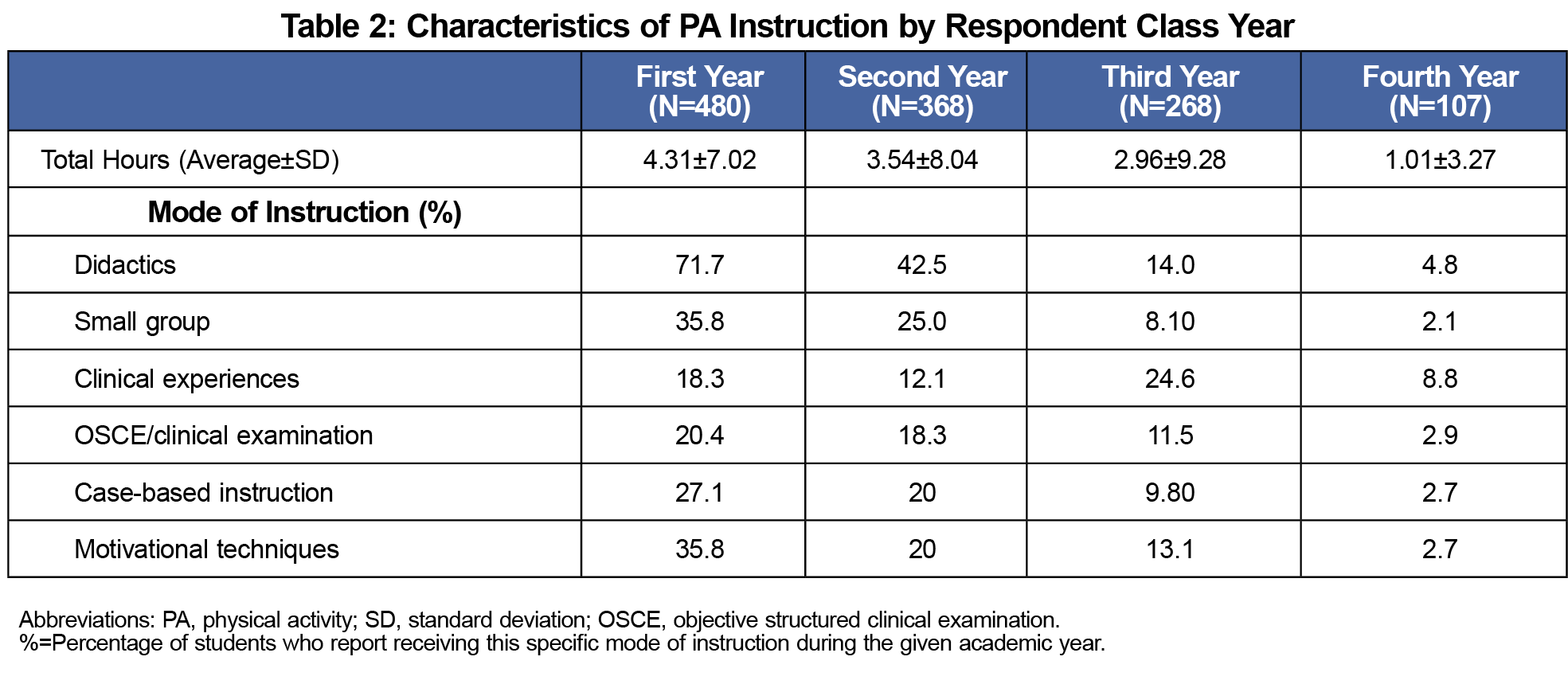 A total of 480 medical students completed the survey, representing 82 US medical schools (69 allopathic, 13 osteopathic, Appendix B). The largest cohort of respondents were third-year students (33.5%). Further demographics can be found in Table 1. Instructional delivery of PA content varied by class year, but 71% of respondents reported at least one instance of exercise-related didactic instruction (Table 2).