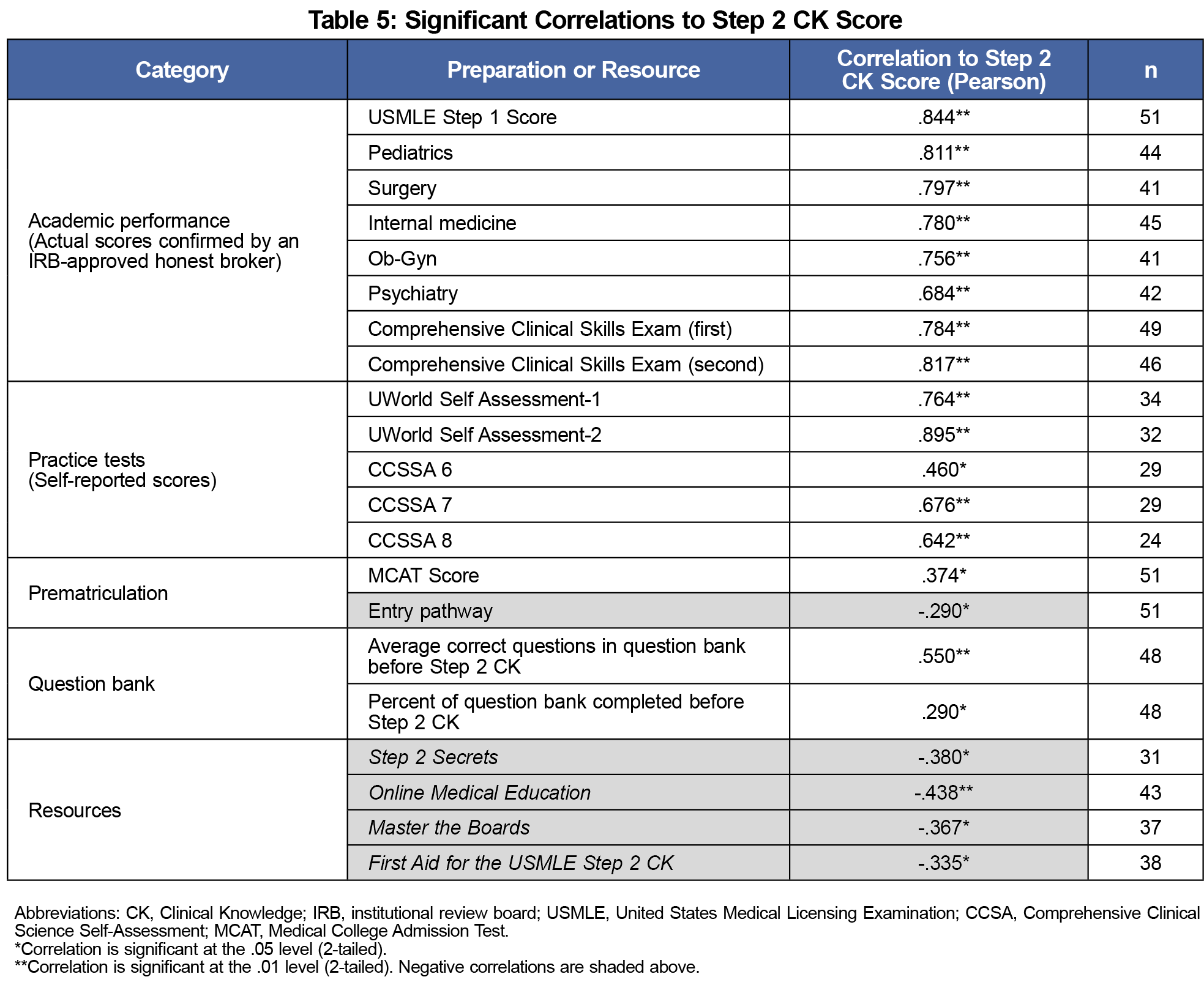 Conclusions: Faculty and staff can optimize students' Step 2 CK performance by encouraging them to work through case-based, clinically-focused questions. Further study is needed to describe optimal preparation strategies better.