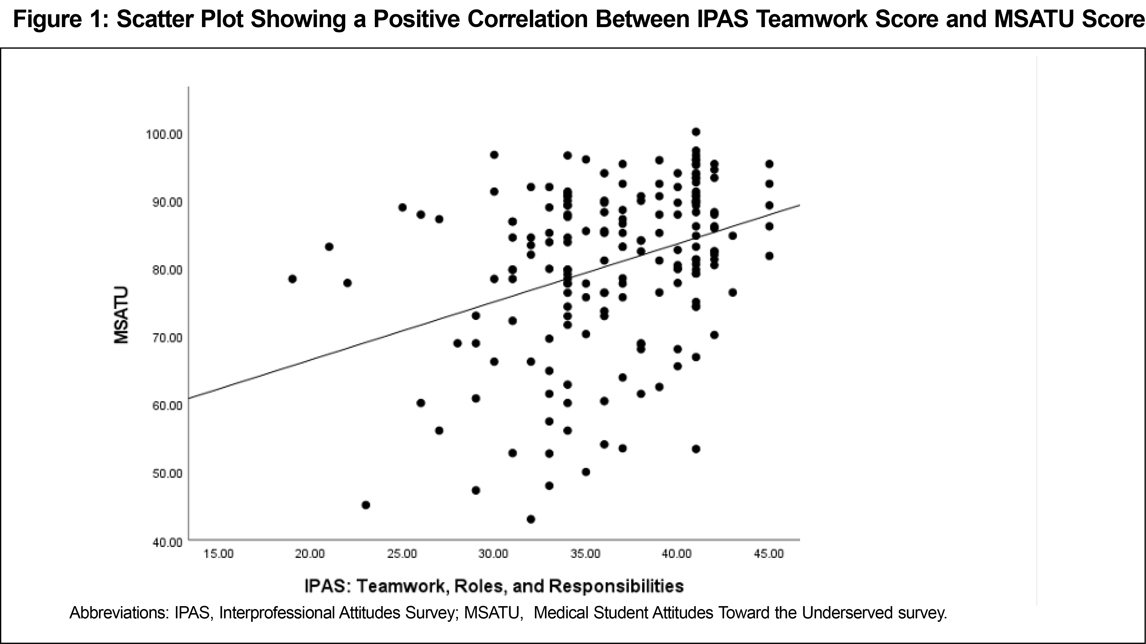We found positive correlations between MSATU scores and the IRI empathy measurement (r [1, 184]=0.48, P<.001) and between MSATU scores and both teamwork and community centeredness as measured by IPAS (Figures 1-3, Table 2).