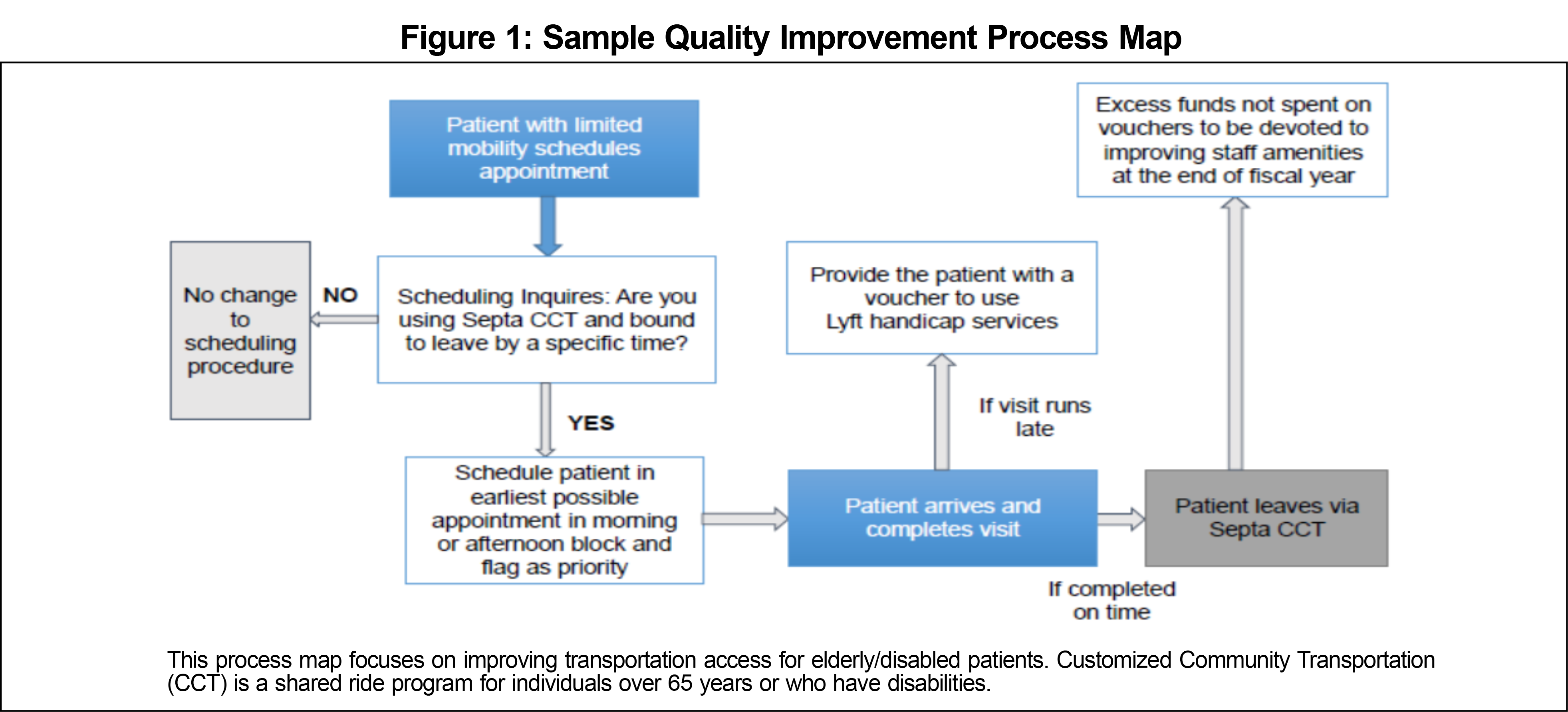 Figure 1 shows a sample process map created by a student group that focuses on improving transportation access for elderly/disabled patients. During the group presentations of their QI projects, students were asked to consider aspects such as cost, feasibility, prioritization, and stakeholder engagement. Particularly, students were challenged to think about how these interventions could be implemented, with a focus on the importance of a multidisciplinary care team. Other examples of student QI interventions included improving behavioral health linkage for individuals with mental illness, connecting diabetic patients to a registered dietician, improving interpreter services to ensure continuity during a visit, and connecting patients with a chronic disability with food delivery services.