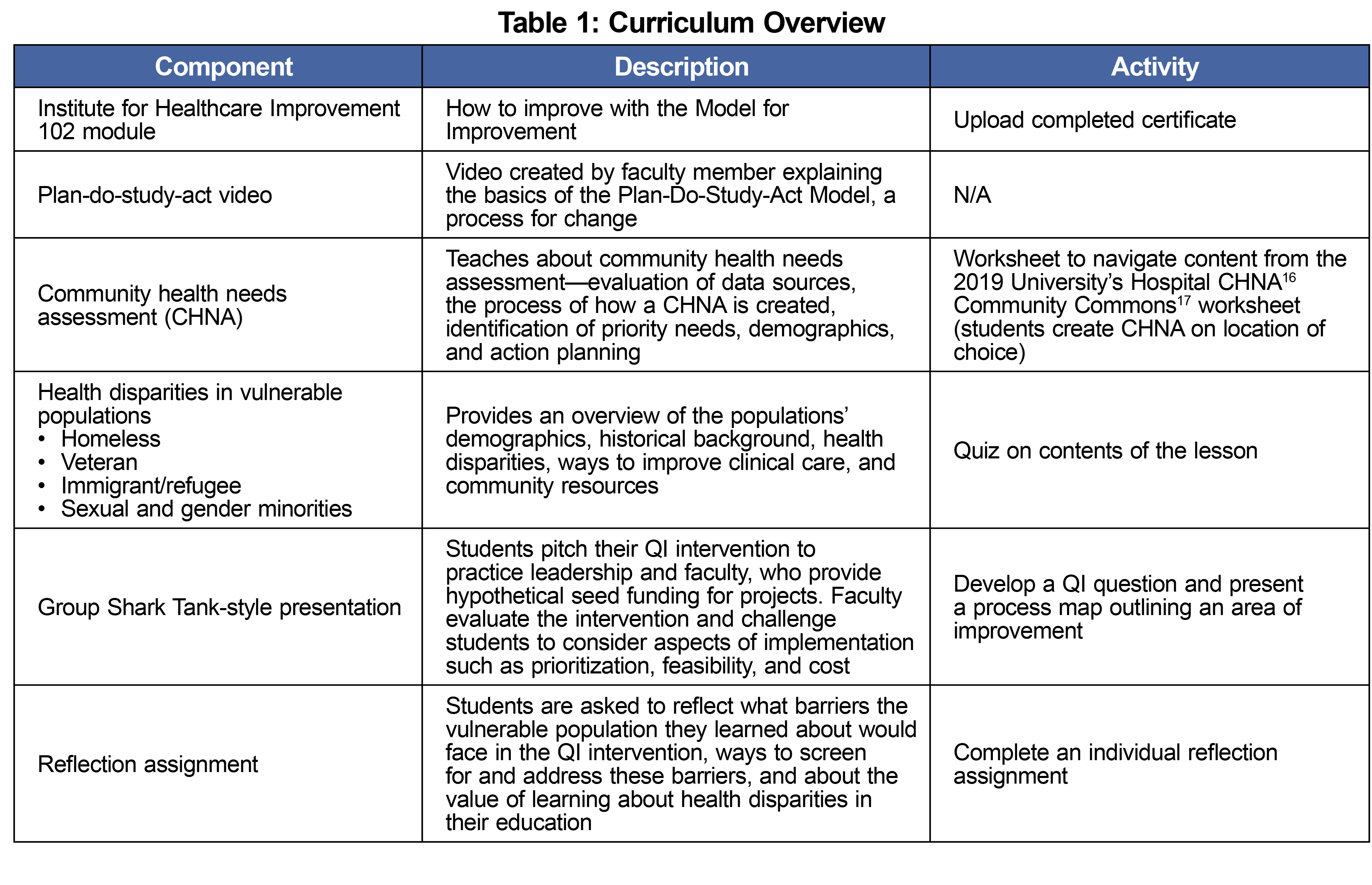 Conclusions: Preliminary evaluation of a combined QI and health disparities curriculum shows improvement in students’ self-reported knowledge of use of a community health needs assessment, QI principles, and care for vulnerable populations.
