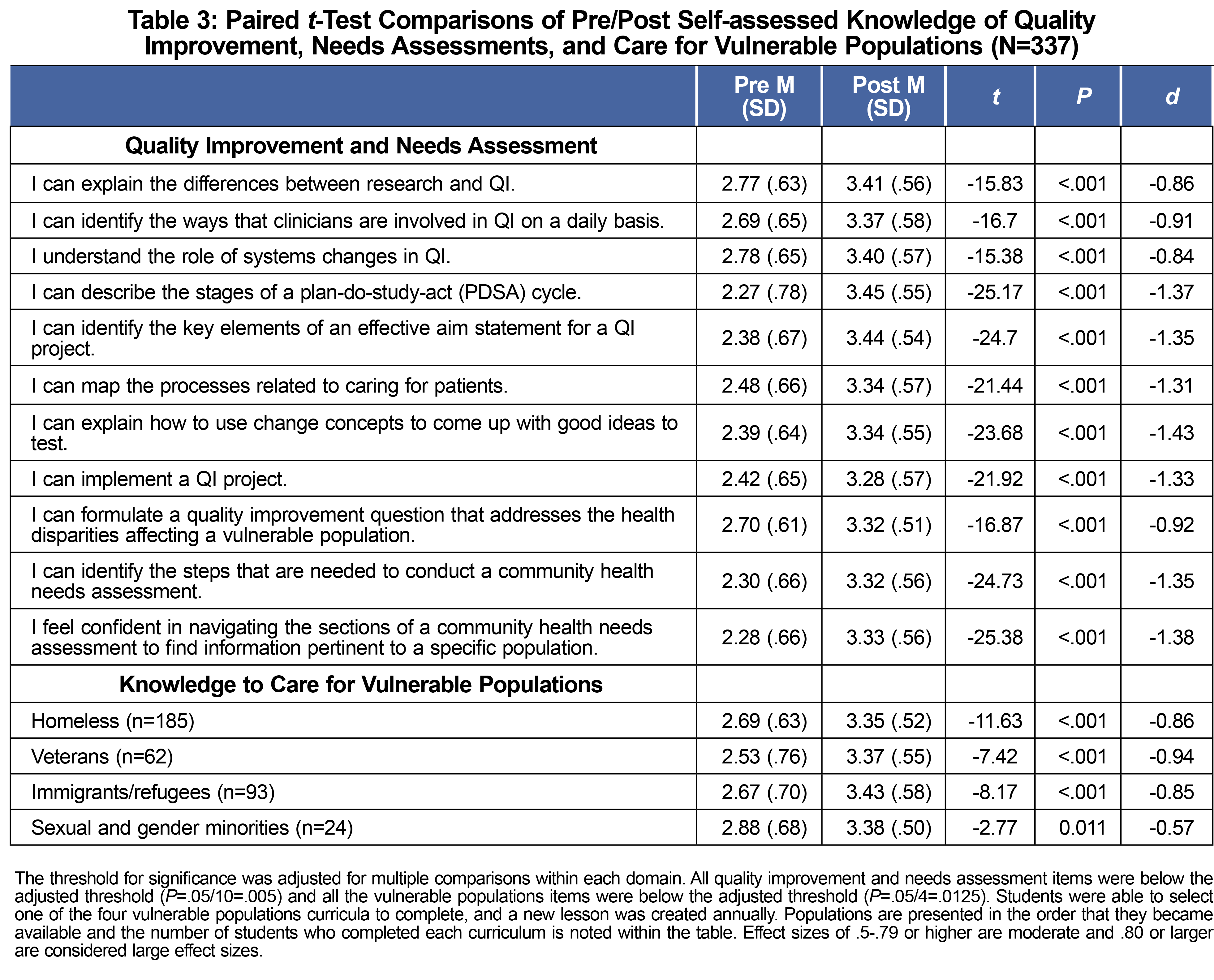 Results: In total, 392 students completed the preassessment survey, 395 students completed the postassessment surveys, and 341 had matching study identifiers. Pre-to-post assessment survey evaluations showed statistically significant changes for nine out of nine QI knowledge questions (P<.001), knowledge regarding a community health needs assessment (P<.001), and knowledge about caring for vulnerable populations (homeless, veterans, immigrants/refugees; P<.001).