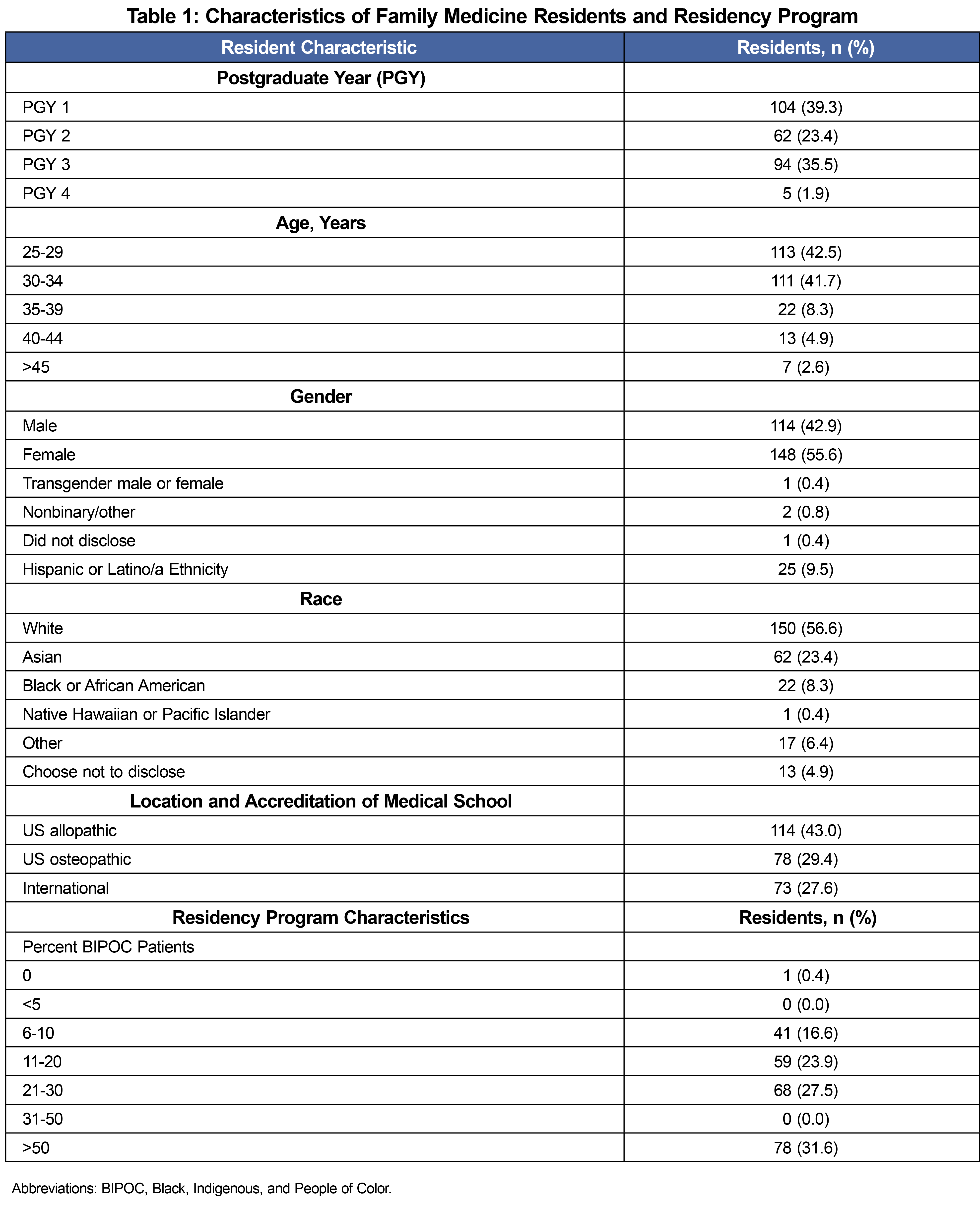 A total of 266 residents participated in the CERA survey. Table 1 lists participant characteristics including their demographic breakdown. Of the residents who responded, a majority (91.5%) believed that addressing racism in medicine is an educational priority, and 32.8% prioritized ranking residencies higher if the program's mission aligned with this (Figure 1). Although BIPOC residents were more likely to respond that RJT should be an educational priority, the difference with non-BIPOC residents was not significant (P=.059). Sixty-five percent of residents believed that their FMRP stated addressing racism in medicine is an educational priority. However only 17.3% of residents believed their programs had regularly scheduled trainings (Table 2).
