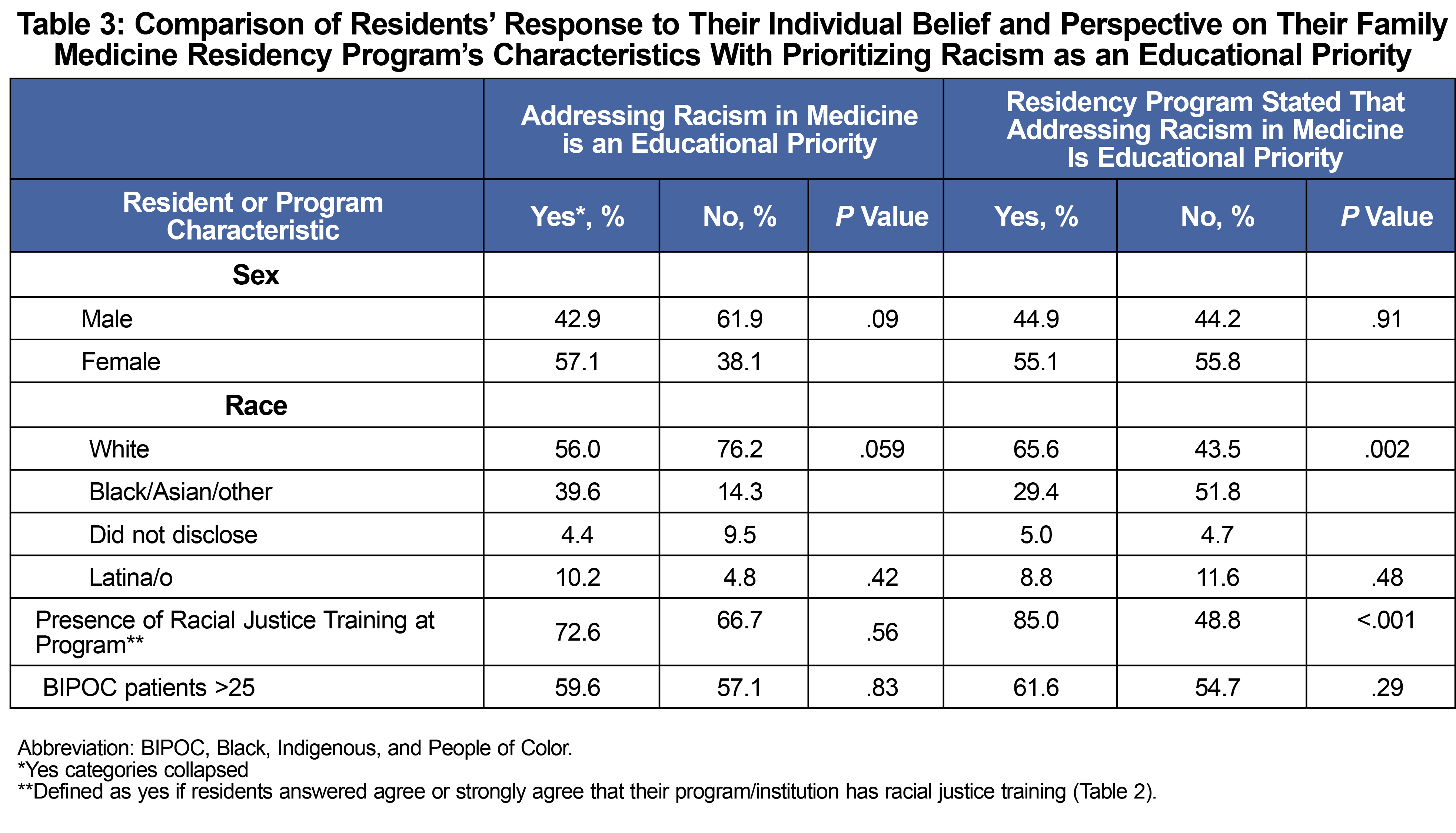 The findings of this CERA study of family medicine residents were consistent with our hypothesis that the majority of responding residents believed that it is important to address racism in medicine. Although less than one-fifth of responding residents believe they have consistent RJT; more than half reported sporadic trainings. Residents were more likely to have RJT if they agreed that their program prioritized addressing racism and if their program served a patient population where majority of patients identify as BIPOC.