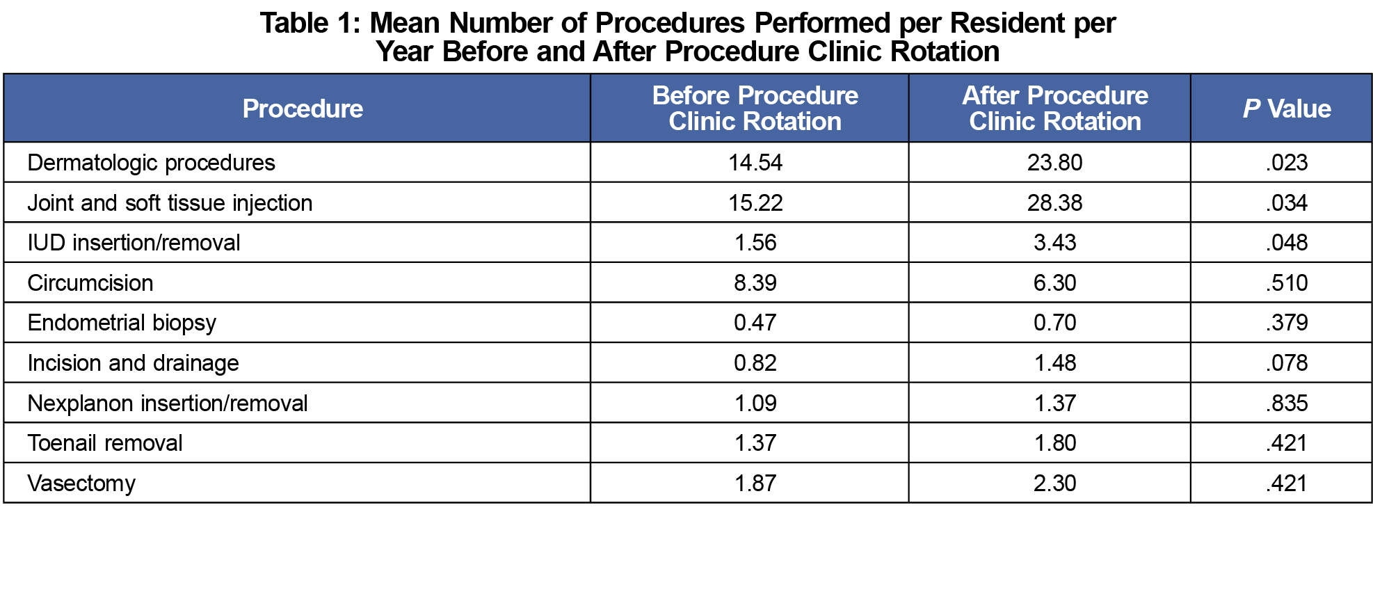 Results: Residents who participated in the procedure clinic rotation performed significantly more dermatologic procedures per year, joint and soft tissue injections and intrauterine device (IUD) insertions and removals, but did not perform significantly more circumcisions, endometrial biopsies, incision and drainages, subdermal contraceptive implant procedures, toenail removals, or vasectomies.