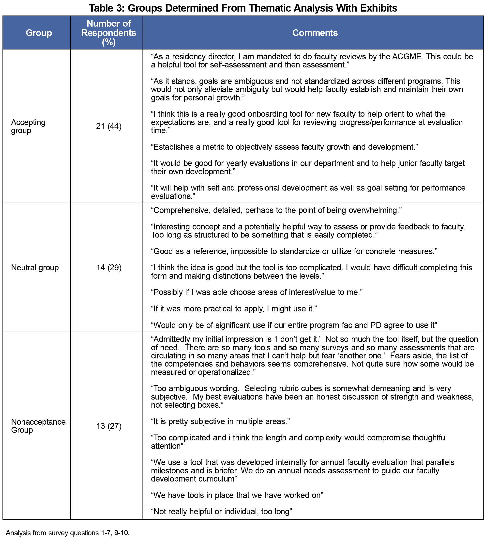 Three distinct groups emerged from the thematic analysis of the open responses regarding educator acceptance of the faculty competencies (Table 3).