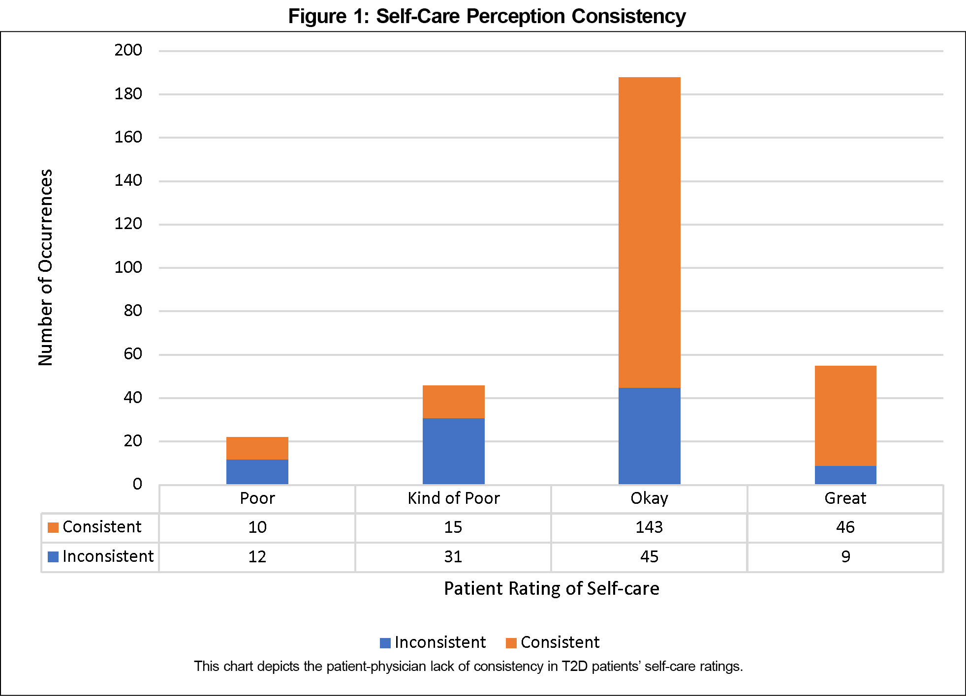 To understand the patient-physician relationship in the context of T2D self-care, we conducted a study of patients with T2D and their physicians to assess their respective perceptions and resulting concordance of patient self-care. We further define this concordance as “Self-care Perception Consistency.” The purpose of this study is to understand how consistent patient and physician perceptions of patient self-care are in primary care settings.
